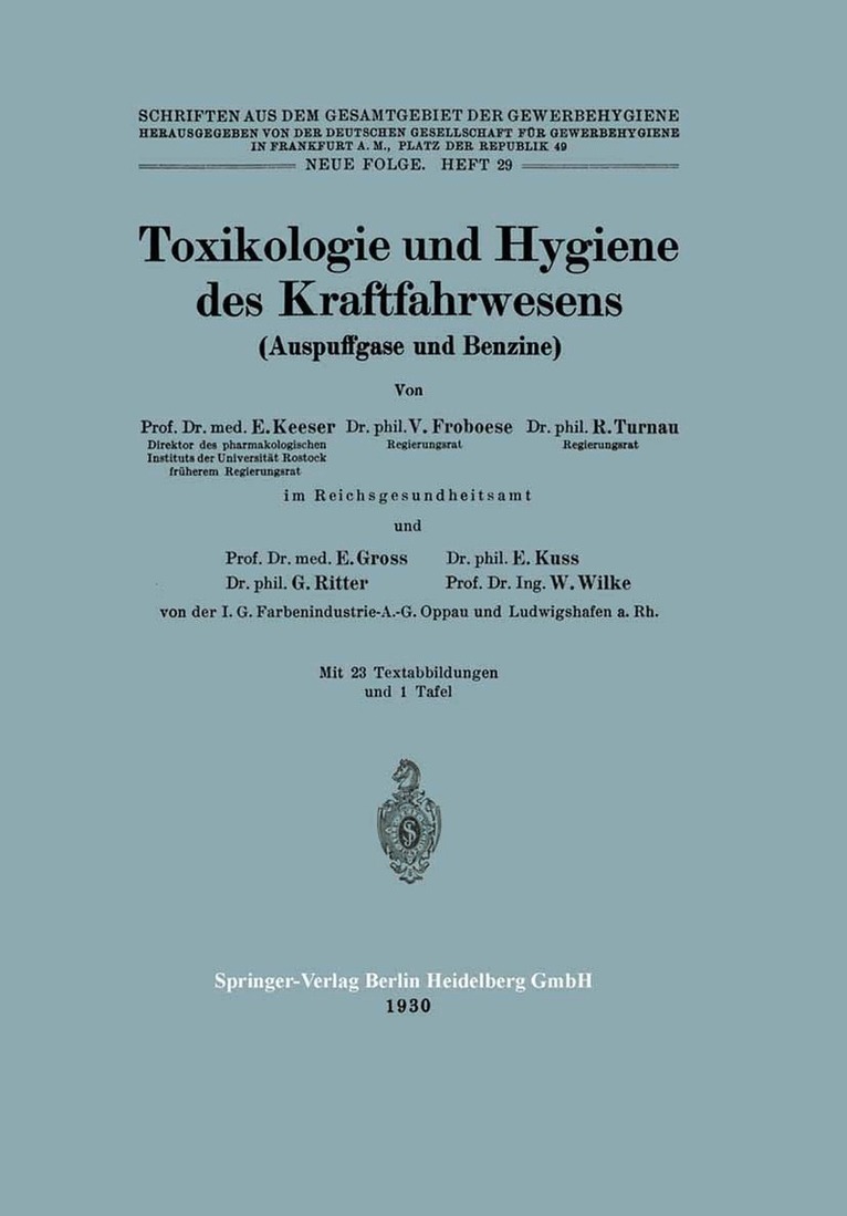 Toxikologie und Hygiene des Kraftfahrwesens (Auspuffgase und Benzine)E. Keeser, V. Froboese, R. Turnau, E. Gross, E. Kuss, G. Ritter, W. Wilke, Deutsche Gesellschaft für Gewerbehygiene Frankfurt a.M.Häftad514 kr