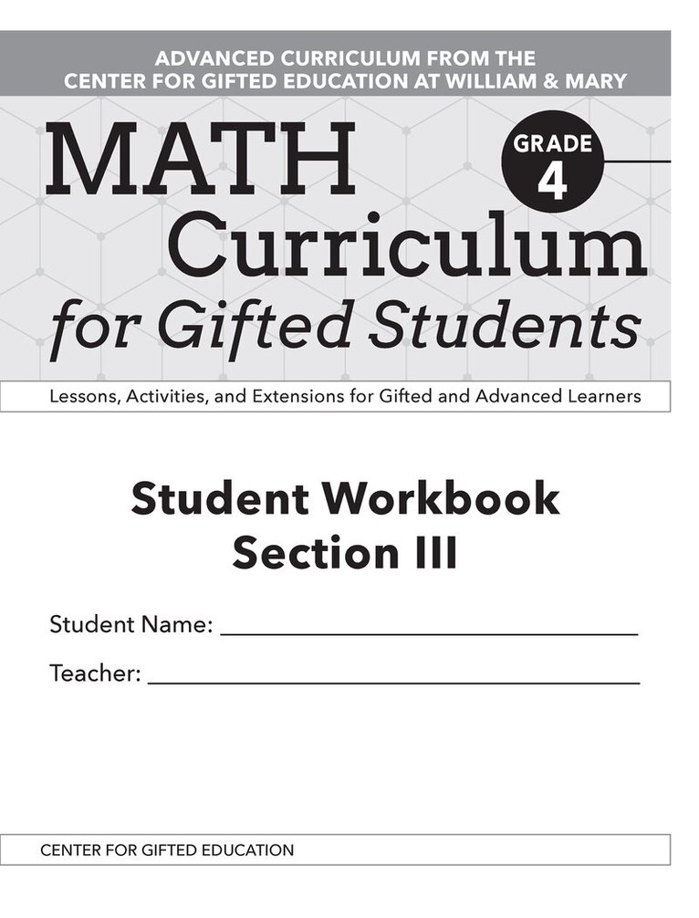 This book, from the Center for Gifted Education at William & Mary, provides gifted and advanced learners challenging activities to master and engage with the Common Core State Standards for English Language Arts through four mini units. Each mini unit is packed with activities that enrich and extend grade-level ELA content for grade 3. Included texts have messages and characters that are developmentally suitable for students. Through higher order reasoning questions, resulting discussions, and student-created products associated with these texts, gifted and advanced students' needs are met while still maintaining messages and characters to which students can relate. Students will be exposed to themes such as choices, culture, beliefs, and perseverance. Each theme was chosen with advanced third-grade students in mind and their emerging need to learn more about themselves, their world, and how to work through adversity to accomplish their goals.Grade 3