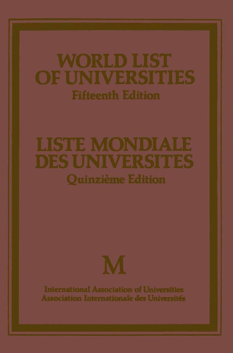 - Frontmatter -- Contents -- Preface -- Guide To The Entries -- Abbreviations -- Afghanistan -- Albania -- Algeria -- Angola -- Argentina -- Austria -- Bahrain -- Belgium -- Benin -- Bolivia -- Brazil -- Bulgaria -- Burkina Faso -- Burma -- Burundi -- Cameroon -- Central African Republic -- Chad -- Chile -- China (People's Republic) -- Colombia -- Congo (People's Republic) -- Costa Rica -- Cuba -- Czechoslovakia -- Denmark -- Dominican Republic -- Ecuador -- Egypt (Arab Republic) -- El Salvador -- Ethiopia -- Finland -- France -- Gabon -- German Democratic Republic -- Federal Republic Of Germany -- Greece -- Guadeloupe -- Guatemala -- Guinea -- Haiti -- Holy See -- Honduras -- Hungary -- Iceland -- Indonesia -- Iran -- Iraq -- Ireland -- Israel -- Italy -- Ivory Coast -- Japan -- Jordan -- Kampuchea -- Korea (Democratic People's Republic) -- Korea (Republic Of) -- Kuwait -- Lao People's Democratic Republic -- Lebanon -- Liberia -- Libya (Socialist People's Libyan Arab Jamahiriya) -- Libya (Socialist People's Libyan Arab Jamahiriya) -- Macau -- Madagascar (Democratic Republic) -- Mali -- Martinique -- Mauritania -- Mexico -- Mongolia (People's Republic) -- Morocco -- Mozambique (People's Republic Of) -- Nepal -- Netherlands -- Netherlands Antilles -- New Caledonia -- Nicaragua -- Niger -- Norway -- Oman -- Pakistan -- Panama -- Paraguay -- Peru -- Philippines -- Poland -- Portugal -- Qatar -- Reunion -- Romania -- Rwanda -- Saudi Arabia -- Senegal -- Somalia -- Republic Of South Africa -- Spain -- Sudan -- Suriname -- Sweden -- Switzerland -- Syrian Arab Republic -- Taiwan -- Thailand -- Togo -- Tunisia -- Turkey -- Union Of Soviet Socialist Republics -- United Arab Emirates -- Uruguay -- Venezuela -- Viet Nam (Socialist Republic Of) -- Yemen Arab Republic -- Yemen (People's Democratic Republic) -- Yugoslavia -- Zaire Republic -- United Nations University -- The European University Institute -- Appendix -- A Note On The International Association Of Universities And Its Permanent Secretariat -- Officers Of The Association -- Publications -- Index