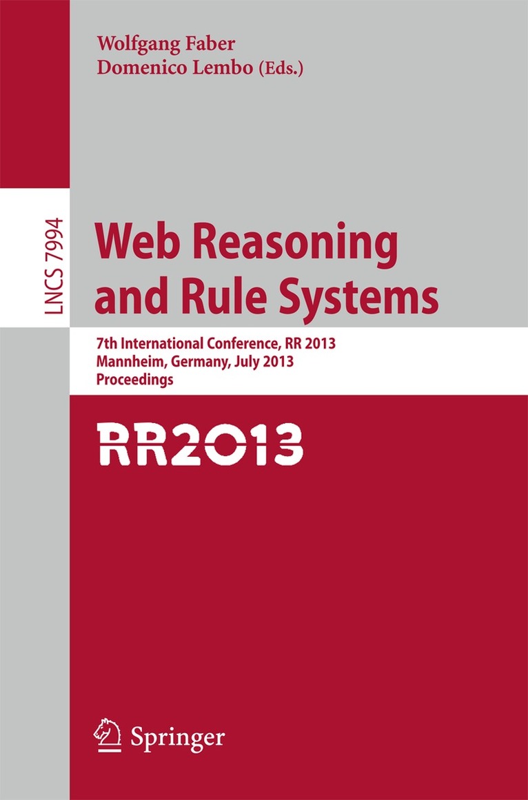ThesearetheproceedingsoftheSixthInternationalConferenceonLogicP- grammingandNonmonotonicReasoning (LPNMR2001). The conference was heldinViennafrom17thto19thofSeptember,2001. Itwascollocatedwiththe JointGerman/AustrianConferenceonArti?cialIntelligence(24thGerman/9th AustrianConferenceonArti?cialIntelligence),KI2001. LPNMR conferences aim to promote research in logic-based programming languages, database systems, nonmonotonic reasoning, and knowledge rep- sentation. LPNMR2001 was the sixth conference in the series. The previous meetingswereheldinWashington,DC,in1991,inLisbon,Portugal,in1993,in Lexington,Kentucky,in1995,inDagstuhl,Germany,in1997,andinElPaso, Texas,in1999. ThetechnicalprogramofLPNMR2001wascomprisedof?veinvitedtalks thatweregivenbyJur .. genDix,GeorgGottlob,PhokionKolaitis,MaurizioLe- erini,andChiakiSakama. Italsocontained23technicalpresentationsselected bytheprogramcommitteeduringarigorousreviewprocess. Finally,asapart ofthetechnicalprogram,theconferencefeaturedaspecialsessioncomprisedof ninepresentationsanddemonstrationsofimplementednonmonotonicreasoning systems. Allthesecontributionsareincludedintheproceedings.Many individuals workedfor the success of the conference. Special thanks areduetoallmembersoftheprogramcommitteeandtoadditionalreviewers fortheire?ortstoproducefairandthoroughevaluationsofsubmittedpapers. Furthermore, we would like to thank the members of the Knowledge Based SystemsGroupoftheViennaUniversityofTechnology,whichtookcareofthe localorganization. Weparticularlyappreciatedthenevertiringe?ortofElfriede Nedoma,secretarytothegroup. WewouldalsoliketothankGerdBrewkafor hissupportiveroleinarrangingthecollocationoftheconferencewithKI2001. Last,butnotleast,wethankthesponsoringinstitutionsfortheirgenerosity.September2001 ThomasEiter WolfgangFaber Miros lawTruszczynski ' Conference Organization ProgramCo-chairs ThomasEiter(ViennaUniversityofTechnology,Austria) Miros lawTruszczynski ' (UniversityofKentucky,USA) ProgramCommittee AlexanderBochman(HolonAcademicInstituteofTechnology,Israel) PieroBonatti(Universit' adegliStudiMilano/Crema,Italy) GerhardBrewka(UniversityofLeipzig,Germany) JamesDelgrande(SimonFraserUniversity,Canada) MarcDenecker(KatholiekeUniversiteitLeuven,Belgium) NormanFoo(UniversityofNewSouthWales,Australia) MichaelGelfond(TexasTechUniversity,USA) KatsumiInoue(KobeUniversity,Japan) AntonisKakas(UniversityofCyprus) NicolaLeone(Universit' adegliStudidellaCalabria,Italy) VladimirLifschitz(UniversityofTexasatAustin,USA) FangzhenLin(TheHongKongUniversityofScienceandTechnology,China) VictorMarek(UniversityofKentuckyatLexington,USA) ZhangMing-Yi(GuizhouAcademyofSciences,China) IlkkaNiemel. a(HelsinkiUniversityofTechnology,Finland) Lu'?sMonizPereira(UniversidadeNovadeLisboa,Portugal) MarcoSchaerf(Universitad ' iRoma"LaSapienza,"Italy) TorstenSchaub(UniversityofPotsdam,Germany) FrancescaToni(ImperialCollege,London,U. K.) Li-YanYuan(UniversityofAlberta,Canada) Publicity Chair WolfgangFaber(ViennaUniversityofTechnology,Austria) Organization VII Additional Reviewers Jos'eAlferes MehmetOrgun CristinaBaroglio MauricePagnucco KrysiaBroda VivianaPatti MauriceBruynooghe NikolayPelov FrancescoBuccafurri GeraldPfeifer CarlosDam'asio FabrizioRiguzzi EmmanuelDeMot RiccardoRosati YannisDimopoulos GiulianaSabbatini EsraErdem FaribaSadri WolfgangFaber ChiakiSakama DayaGaur FrancescoScarcello JensHappe TommiSyrjanen TomiJanhunen AndreaTettamanzi JoohyungLee BertVanNu?elen NicolaLeone HelmutVeith ThomasLinke GerardVreeswijk ThomasLukasiewicz KewenWang PaoloMancarella Jia-HuaiYou CristinelMateis DongmoZhang RobMiller Sponsoring Institutions We would like to acknowledge ?nancial support for the conference from the EuropeanO?ceofAerospaceResearchandDevelopment(EOARD),underc- tractF61775-01-WF077,theAustrianComputerSociety(OCG),theEuropean Commission,theAustrianMinistryofTransport,Innovation&Technology,and Microsoft. Table of Contents Invited Papers AComputationalLogicApproachtoHeterogenousAgentSystems ...1 JurgenDix DeclarativeInformationExtraction,WebCrawling, andRecursiveWrappingwithLixto ...21 RobertBaumgartner,SergioFlesca,andGeorgGottlob OntheComplexityofModelCheckingandInference inMinimalModels(ExtendedAbstract) ...42 LefterisM. KirousisandPhokionG. Kolaitis DataIntegrationNeedsReasoning ...54 MaurizioLenzerini NonmonotonicInductiveLogicProgramming ...62 ChiakiSakama Regular Papers StrongEquivalenceforLogicPrograms andDefaultTheories(MadeEasy)...81 HudsonTurner OntheE?ectofDefaultNegationontheExpressiveness ofDisjunctiveRules ...93 TomiJanhunen OntheExpressibilityofStableLogicProgramming ...107 V. W. MarekandJ. B. Remmel OntheRelationshipbetweenDefeasibleLogic andWell-FoundedSemantics ...121 GerhardBrewka AComparativeStudyofWell-FoundedSemantics forDisjunctiveLogicPrograms ...133 KewenWang ReasoningwithOpenLogicPrograms ...147 PieroA. Bonatti RepresentationofIncompleteKnowledgebyInduction ofDefaultTheories...