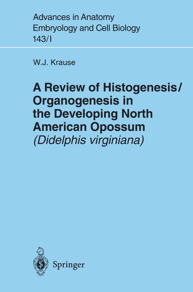 This is a review of the pre- and postnatal development in the North American opossum (Didelphis virginiana), presented in two volumes. This second volume summarizes the histogenesis/organogenesis of the respiratory, digestive, urinary, male and female reproductive and classical endocrine systems. Volume I summarizes gametes and fertilization, blastocyst formation and early organogenesis, foetal membranes and placentation, parturition and migration to the pouch, general postnatal growth development and histogenesis/organogenesis of the integument, musculoskeletal system, cardiovascular system, blood and blood-forming organs, lymphatic organs, nervous system, eyes and ears.