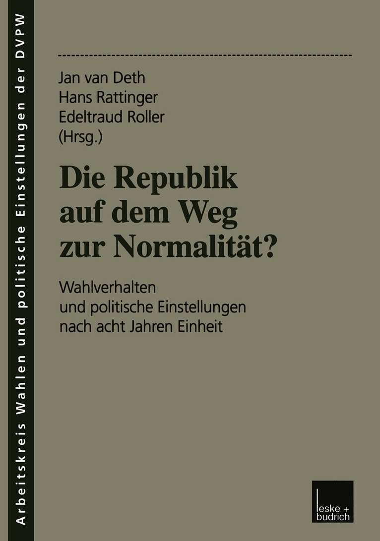 - Einleitung: Wirklich ein Volk? Die politischen Orientierungen von Ost- und Westdeutschen im Vergleich.- I Wahrnehmung und Bewertung des politischen Systems.- Demokratische Einstellungen in einem Land ohne demokratische Traditionen? Die Unterstützung der Demokratie in den neuen Bundesländern im Ost-West-Vergleich.- Frischer Wind in einer alten Beziehung? Political Efficacy und die Bundestagswahl 1998.- Talkin’ ‘bout my generation — Generationseffekte auf politische Einstellungen in Deutschland.- Politisches Interesse und politisches Wissen in Ost- und Westdeutschland.- II Politische Institutionen und Akteure.- Das politische Institutionenvertrauen in den 90er Jahren.- Die Bürger und ihre Parteien.- Parteien und Verbände als Vertreter von Bürgerinteressen.- Die deutschen Politiker in der Sicht der Bevölkerung — Wert-, Macht- oder Funktionselite?.- III Wertorientierungen und Ideologien.- Politische Ideologie im vereinigten Deutschland.- Gesellschaftspolitische Wertorientierungen und Staatszielvorstellungen im Ost-West-Vergleich.- Politischer Extremismus.- Ausländerfeindlichkeit im vereinigten Deutschland.- IV Einstellungen zu Politik und Gesellschaft.- Politische Prioritäten und die Einschätzung der Problemlösungskompetenz der Parteien.- Einstellungen zu Wirtschaft und Gesellschaft in den alten und neuen Bundesländern.- Reality Bytes: Wie die Medienberichterstattung die Wahrnehmung der Wirtschaftslage beeinflußt.- DDR-Nostalgie? Analysen zur Identifikation der Ostdeutschen mit ihrer politischen Vergangenheit, zur ostdeutschen Identität und zur Ost-West-Stereotypisierung.- V Politische Partizipation — Wahlverhalten.- Politische Beteiligung in Deutschland — Strukturen und Erklärungsfaktoren.- Appelle zu taktischem Wahlverhalten — effektive Werbungoder verfehlte Wahlkampfrhetorik?.- Mit Sicherheit zum Erfolg? Sicherheit der Wahlbeteiligung und Sicherheit der Wahlabsicht als Möglichkeit zur Qualifizierung der Wahlabsichten bei Wahlprognosen.- Die Autoren.