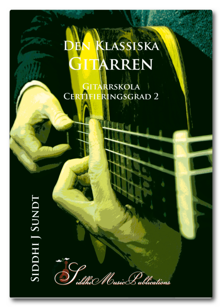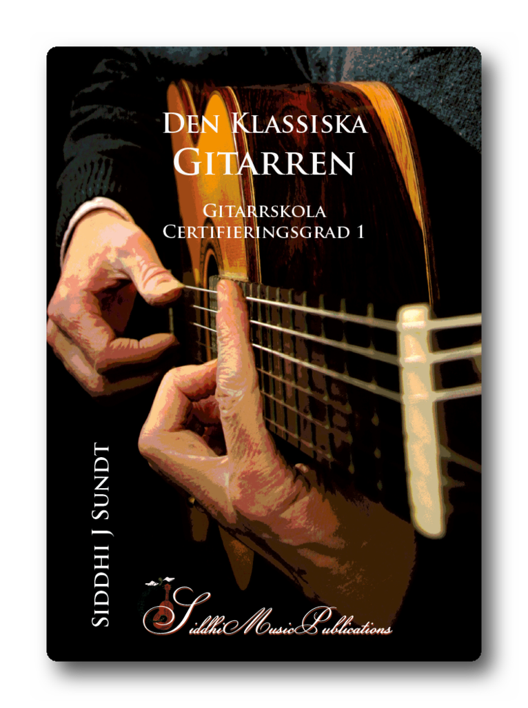 Upplägget och hur du använder materialet. Boken inleds med en snabbstart, där eleven utan förkunskaper och utan tekniska krav lär sig att spela ett par melodier bara genom att trycka ett finger (gärna finger 2) på olika band på sträng ett. Det finns också ett komp (bas) som är lika enkelt upplagt. Eleven och läraren kan växla stämma och på så sätt kan eleven uppleva det första samspelet. Därefter kommer en genomgång av de viktigaste begreppen, notkunskap och att stämma gitarren. Beroende på vilka eventuella förkunskaper eleven har kan denna del behöva fördjupas med hjälp av lärarledd träning. Inga särskilda övningar erbjuds, förutom en notrebus. I övrigt uppmanar jag läraren till lyhördhet och med egen kreativitet guida eleven till stabil kunskap i grunderna. Själva spelboken inleds med att vi går igenom stamtonerna på greppbrädan med början på sträng 3 och tonerna G, A och B. Genom att spela de tre tonerna på samma sträng, i läge två, lär sig eleven att rada upp fingrarna på en sträng och tvingas till korrekt handställning direkt (fågelnäbben, sid 10). Anslagshanden behöver inte heller ta hänsyn till något strängbyte, utan kan lugnt alterera med pek- och långfinger och öva stödanslag på betonade toner och fritt anslag på övriga. Därefter får eleven gå igenom samma material i läge I, varvid anslagshanden får ta itu med problematiken som strängbytet innebär. Eleven får systematiskt lära sig sträng för sträng och läge för läge - upp till den åttonde tonen (G1 - G2) och upp till läge V. Genom att spela samma melodier och övningar, dels på en sträng och sedan också i olika lägen lär eleven sig grundligt att hitta på greppbrädan. Dessutom får eleven, genom att hen tränar på detta sätt lättare en korrekt handställning. Tränar hen de rätta styrmusklerna i handen med rätt medvetenhet kommer detta att ske nästan ”automagiskt”. Ett par viktiga begrepp introduceras: Spårvagnen beskriver hur man byter läge. Pekfingret är loket, strängen är spåret, läget är hållplatsen och de övriga fingrarna är vagnarna som följer loket. Loket lämnar aldrig strängen utan glider längs strängen utan att trycka ned eller lyfta upp fingret. Vagnarna däremot följer loket längs med strängen men strax ovanför utan att nudda strängen. Sträckt finger (vanligtvis lillfingret) förekommer då avståndet mellan t ex finger tre och fyra är mer än ett band, dvs en stor sekund. Ersättningsfinger förekommer då ett ordinarie finger annars skulle behöva hoppa mellan två strängar (t ex finger tre på tonerna c (sträng 3) och e (sträng 2) i tredje läget. Finger 2 på tonen c blir då ersättningsfinger för finger 3). Viktiga musikbegrepp som treklang, fyrklang, ackord och intervall upp till oktav tränas. Barré över två och tre strängar introduceras (sid 70). Boken avslutas med några melodier i duoarrangemang.