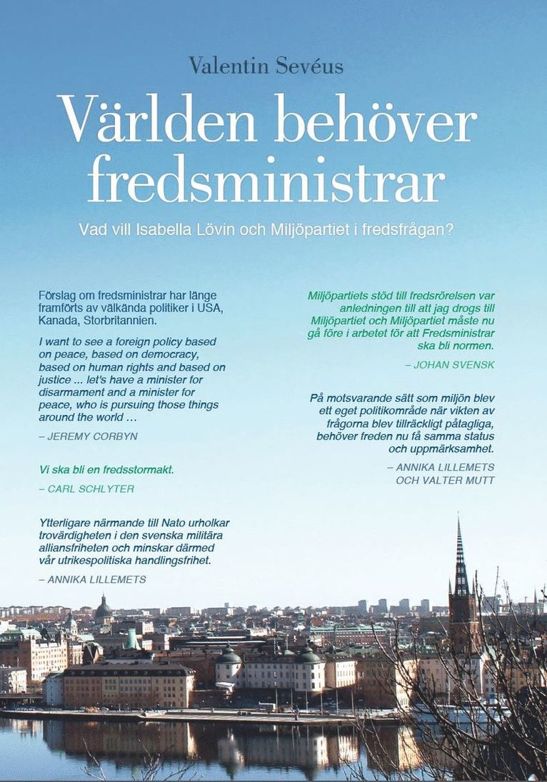Det råder stor obalans mellan ekonomiska investeringar i krig respektive fred. Miljarder och åter miljarder används till utveckling av vapen, krigsplanering och krigföring. I jämförelse med dessa enorma kostnader är vad som satsas på diplomati, dialog och andra civila specifikt fredsfrämjande åtgärder blott en droppe i havet. Sedan länge finns tankar om att det behövs fredsdepartement i världens regeringskanslier. Jeremy Corbyn har lovat att utse en fredminister om han får makten i Storbritannien. I USA:s kongress finns en färdig lagtext som noga specificerar vad en fredsminister bör göra. I Sverige har denna fråga diskuterats intensivt inom Miljöpartiet sedan Valter Mutt i riksdagen 2013 föreslog att frågan om fredsdepartement borde utredas. Nu har den diskussionen också tagit fart inom Socialdemokraterna och andra partier sedan ett nytt nätverk för FredsKultur bildats 2017. En svensk regering borde bli en fredsregering som arbetar fram en långsiktig strategi i samarbete med global expertis för ett kommande globalt paradigmskifte från våldskultur till fredskultur. Palmekommissionens ”Gemensam säkerhet” var ett steg i den riktningen. Inrättandet av fredsdepartement är det strategiskt viktigaste steg som nu kan tas för en framtid med fred för alla. Det Jeremy Corbyn kan borde en svensk statsminister också kunna!