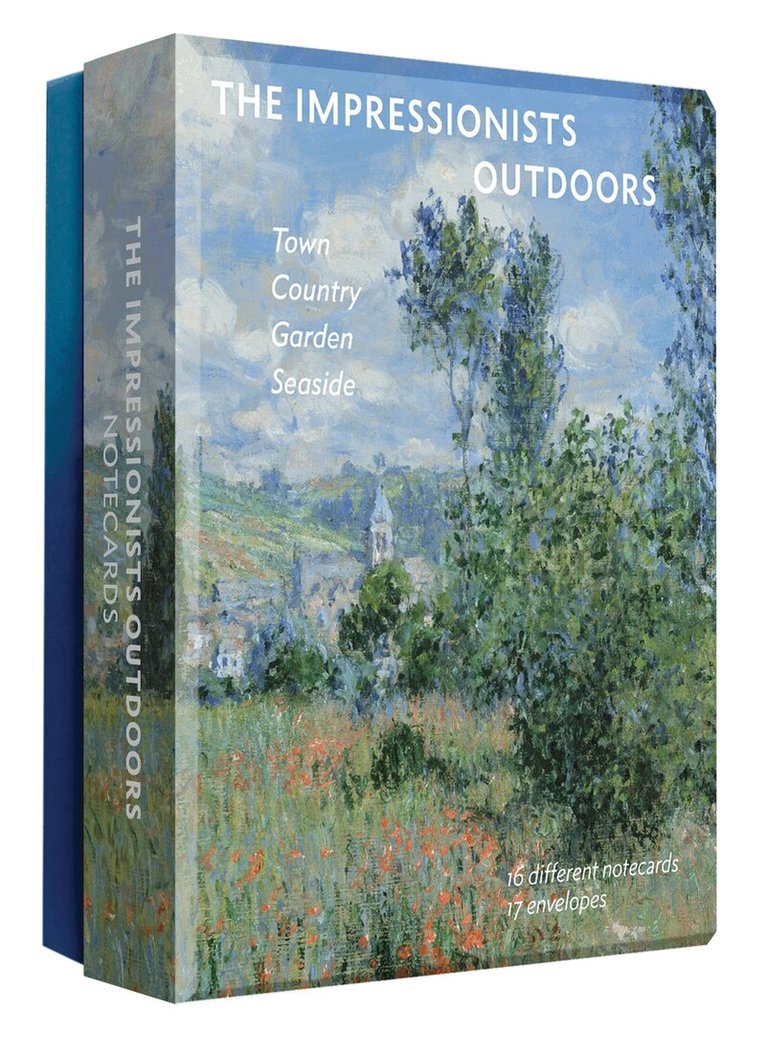 Join the Impressionists en plein air with this elegant notecard set.These notecards (each measuring 133 x 110 mm) feature sixteen appealing landscape paintings by the Impressionists, from a sun-dappled garden by Monet, to a festive picnic by Renoir, to a harvest field by Pissarro, to a beach scene by Cassatt. Housed in a sturdy and attractive box, this notecard set is the perfect stationery for anyone who loves great art or beautiful scenery.Artists included: Gustave Caillebotte, Camille Pissarro, Auguste Renoir, Alfred Sisley, Claude Monet, Berthe Morisot, Mary Cassatt, William Merritt Chase.
