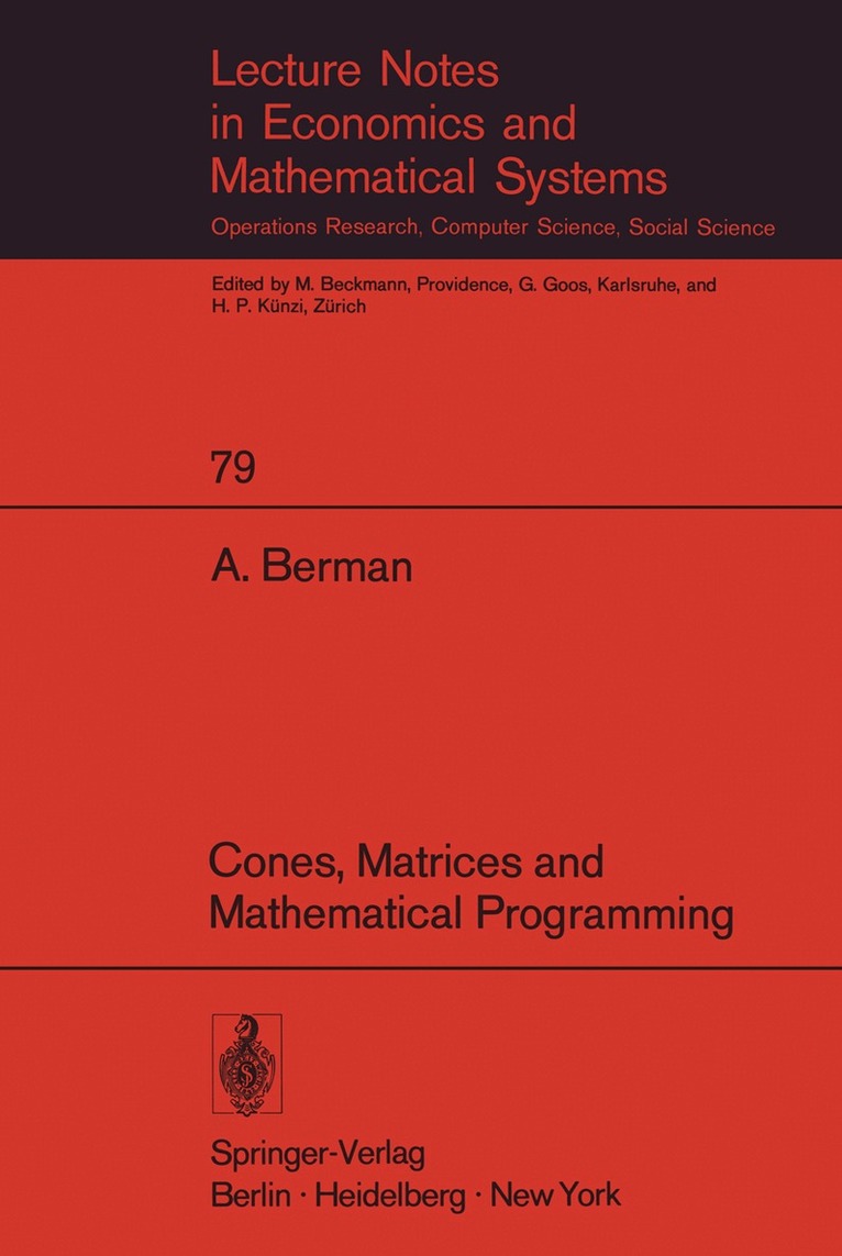This monograph is a revised set of notes on recent applications of the theory of cones, arising from lectures I gave during my stay at the Centre de recherches mathematiques in Montreal. It consists of three chapters. The first describes the basic theory. The second is devoted to applications to mathematical programming and the third to matrix theory. The second and third chapters are independent. Natural links between them, such as mathematical programming over matrix cones, are only mentioned in passing. The choice of applications described in this paper is a reflection of my p«r9onal interests, for examples, the complementarity problem and iterative methods for singular systems. The paper definitely does not contain all the applications which fit its title. The same remark holds for the list of references. Proofs are omitted or sketched briefly unless they are very simple. However, I have tried to include proofs of results which are not widely available, e.g. results in preprints or reports, and proofs, based on the theory of cones, of classical theorems. This monograph benefited from helpful discussions with professors Abrams, Barker, Cottle, Fan, Plemmons, Schneider, Taussky and Varga.