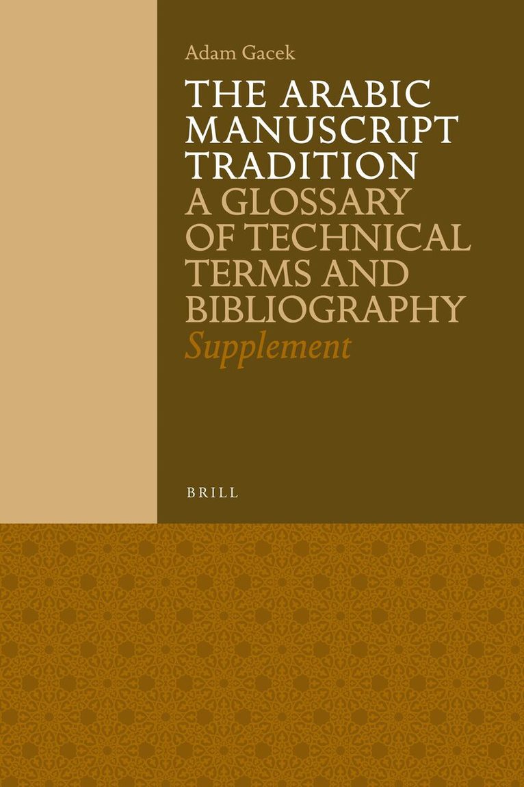 The present work supplements the original volume of The Arabic Manuscript Tradition (AMT), both its glossary of technical terms and bibliography. It includes new entries of technical terms, additional definitions of, and/or citations for, the entries already found in AMT, and recent publications on various aspects of Arabic manuscript studies arranged by subject. Among additional features there are illustrations of various Arabic letterforms and an alphabetical index of all works cited in both AMT and its supplement.
