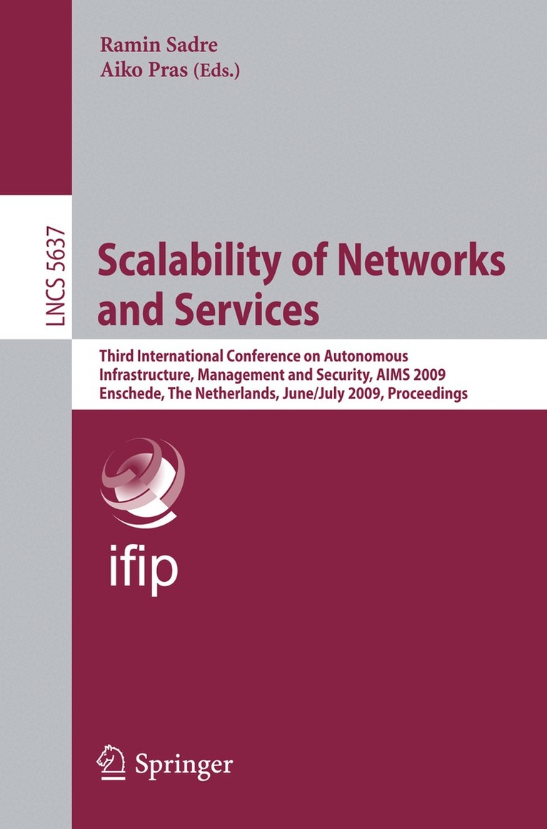 This volume of the Lecture Notes in Computer Science series contains the papers accepted for presentation at the Third International Conference on Autonomous - frastructure, Management and Security (AIMS 2009). The conference took place in Enschede, The Netherlands, hosted by the University of Twente. AIMS 2009 was - ganized and supported by the EC IST-EMANICS Network of Excellence (#26854) and co-sponsored by IFIP WG 6.6 and the Strategic Research Orientation of the University of Twente on Dependable Systems and Networks (DSN). AIMS 2009 constituted the Third edition of a single-track and standalone c- ference on management and security aspects of distributed and autonomous systems, which took place initially in Oslo, Norway in June 2007, followed by AIMS 2008 in Bremen, Germany. The theme of the AIMS 2009 conference was “Scalability of Networks and S- vices,” focusing on how scalable networked systems can be monitored, managed, and protected in an ef cient and autonomous way. The research papers that have been - lected for publication in the present proceedings have approached this theme from d- ferent perspectives, covering topics such as network resource management, overlays andpeer-to-peernetworks,networkcon gurationandoptimization,andmonitoringand visualization.
