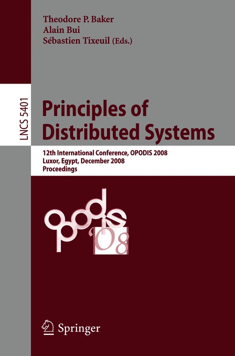 Thisvolumecontainsthe30regularpapers,the11shortpapersandtheabstracts oftwoinvited keynotesthatwerepresentedatthe12thInternationalConference on Principles of Distributed Systems (OPODIS) held during December 15-18, 2008 in Luxor, Egypt. OPODIS is a yearly selective international forum for researchers and prac- tioners in design and development of distributed systems. This year, we received 102 submissions from 28 countries. Each submission was carefully reviewed by three to six Program Committee members with the help of external reviewers, with 30 regular papers and 11 short papers being selected. The overall quality of submissions was excellent and there were many papers that had to be rejected because of organization constraints yet deserved to be published. The two invited keynotes dealt with hot topics in distributed systems: "The Next 700 BFT Protocols" by Rachid Guerraoui and "On Rep- cation of Software Transactional Memories" by Luis Rodriguez. On behalf of the Program Committee, we would like to thank all authors of submitted papers for their support. We also thank the members of the Ste- ing Committee for their invaluable advice.We wish to express our apprec- tion to the Program Committee members and additional external reviewers for their tremendous e?ort and excellent reviews. We gratefully acknowledge the Organizing Committee members for their generous contribution to the s- cess of the symposium. Special thanks go to Thibault Bernard for man- ing the conference publicity and technical organization. The paper submission and selection process was greatly eased by the EasyChair conference system (http://www. easychair. org).