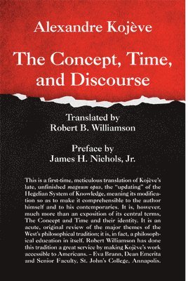 Alexandre Kojève (1902–1968) is most widely known in America for his provocative assertion that history is at its end, that is, its completion. In the “practical” sense, this means that the process of historical development can at last be seen (if from a distance) as the realization of the Marxist “universal and homogeneous state.” However, Kojève claimed as well that the history of philosophical thinking had also reached its goal in the transformation of philosophy, as the “love of wisdom” (or the unsatisfied quest for comprehensive knowledge), into that very Wisdom itself and had done so in the most essential respects in the philosophy of Hegel.The Concept, Time, and Discourse is the first volume of Kojève’s magnum opus, which was to have given an exposition of the (Hegelian) System of Knowledge and of which five volumes were written before his death. It contains, along with a preliminary discussion of the need for an updating of the Hegelian system, the first two of three introductions to the exposition of that system: a First Introduction of the Concept (the integrated totality of what is comprehensible, which is the final object of philosophic inquiry) and a Second Introduction concerning Time, both introductions leading to the (Hegelian) identification of the Concept with Time, an identification which alone takes adequate account of the fact that Philosophy is necessarily discursive (that it must actualize the requirements and essential structure of Discourse).The present volume offers Kojève’s fullest statement of his Ontology. It includes a critical discussion of the traditional oppositions of the “general” to the “particular” and of the “abstract” to the “concrete” and an analysis of the act of “generalizing abstraction,” which detaches Essence from the Existence of Things. Kojève then discusses the three great figures in the three-stage development of philosophy into wisdom: Parmenides, Plato, and Hegel. Parmenides’ monadic account of Being (= Eternity) rendered it ineffable, thereby reducing philosophy to (non-philosophic) silence; Plato’s dyadic account of Being (as eternal) was intended to make Being a possible subject of discourse but failed to reflect adequately the triadic (and temporally developing) structure which Plato himself discerned in Discourse. Finally, Hegel’s triadic account of Being as itself “dialectical” achieved the final identification of the Concept with Time.This is a first-time, meticulous translation of Kojève’s late, unfinished magnum opus, the “updating” of the Hegelian System of Knowledge, meaning its modification so as to make it comprehensible to the author himself and to his contemporaries. It is, however, much more than an exposition of its central terms, The Concept and Time and their identity. It is an acute, original review of the major themes of the West’s philosophical tradition; it is, in fact, a philosophical education in itself. Robert Williamson has done this tradition a great service by making Kojève’s work accessible to Americans. – Eva Brann, Dean Emerita and Senior Faculty, St. John’s College, Annapolis, MarylandWe now recognize Alexandre Kojève as one of the central figures of 20th century European philosophy. A translation of his The Concept, Time, and Discourse will enable English speaking readers to have a fuller understanding of his remarkably ambitious intellectual project. – Michael S. Roth, President, Wesleyan University, Middletown, Connecticut.Robert B. Williamson is Tutor Emeritus at St. John’s College in Annapolis, Maryland, where he continues to teach. He is co-author, with Alfred Mollin, of An Introduction to Ancient Greek (University Press of America) and the author of articles on Plato’s philosophy and Einstein’s early work on relativity theory.James H. Nichols, Jr. is Professor of Government and Dr. Jules L. Whitehill Professor of Humanism and Ethics at Claremont McKenna College, where he teaches political philosophy. Among his publications are Epicurean Political Philosophy: The De rerum natura of Lucretius, translations with interpretations of Plato’s Gorgias and Phaedrus, and most recently Alexandre Kojève: Wisdom at the End of History.