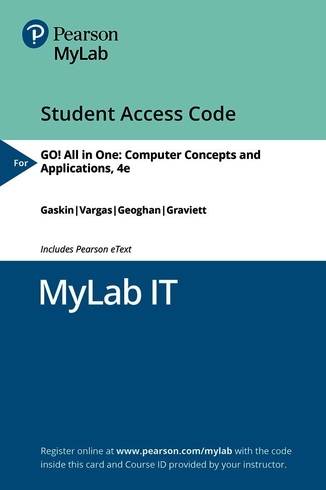 Now live! SUMMER 2020 DIGITAL UPDATEMicrosoft Office 365 updates are reflected in the eText and associated MyLab activities. These updates reduce student confusion and keep course materials current throughout the Office lifecycle. For details on the summer 2020 updates, see the Product Announcements page in MyLab IT.For introductory courses in Microsoft® Office.This package includes MyLab IT.Seamless digital instruction, practice, and assessmentFor over 17 years, instructors have relied upon the GO! series to teach Microsoft Office successfully. The series uses a project-¿based approach that clusters learning objectives around projects, rather than software features, so students can practice solving real business problems. Gaskin uses easy-to-follow Microsoft Procedural Syntax so students always know where to go on the ribbon; she combines this with a Teachable Moment approach that offers learners tips and instructions at the precise moment they're needed. Updated to Office 365, GO! with Microsoft® Office 365®, 2019 Edition, Introductory adds tips for Mac users, revised instructional projects, and improved coverage of the what, why, and how of skills application.Personalize learning with MyLab ITBy combining trusted author content with digital tools and a flexible platform, MyLab personalizes the learning experience and improves results for each student. MyLab IT 2019 delivers trusted content and resources through an expansive course materials library, including new easy-to-use Prebuilt Learning Modules that promote student success. Through an authentic learning experience, students become sharp critical thinkers and proficient in Microsoft Office, developing essential skills employers seek.013576887X / 9780135768877 GO! with Office 2019 Introductory, 1/e + MyLab IT w/ Pearson eText, 1/ePackage consists of: