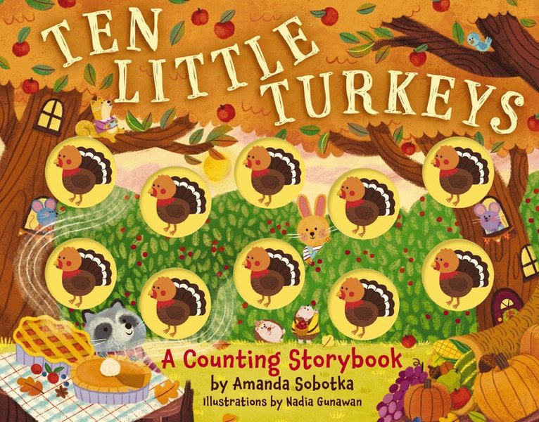 Count along with Ten Little Turkeys and watch as they disappear!Ten little turkeys in the fall sunshine, one bakes an apple pie and then there are…nine! Learning to count has never been more fun. This unique board book counts from ten little turkeys all the way down to one with adorable illustrations. With each page, one more turkey disappears. To demonstrate this concept, this book uses tactile turkey buttons to help children count how many little turkeys are left as the story progresses. Follow along with the easy rhythm and rhymes of this story and let your child touch the colorful, built-in turkey toys for a creative, hands-on approach to counting. Start young ones on a lifetime of loving reading and learning with Ten Little Turkeys.