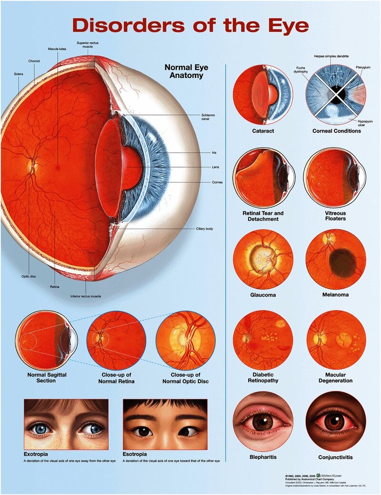Disorders of the Eye Anatomical Chart, Third Edition features anatomy and clinical conditions of the eye with colorful detailed illustrations, all fully labeled, including diverse eye colors and skin tones. Normal eye anatomy, with cross section Cataract Corneal conditions Retinal tear and detachment Vitreous floaters Glaucoma Melanoma Diabetic retinopathy Macular degeneration Blepharitis and conjunctivitis Normal sagittal section with close-ups of normal retina and optic disc Exotropia and esotropia 20" x 26" heavy paper laminatedConsultant (2025): Christopher J. Rapuano, MD, Wills Eye HospitalOriginal medical illustrations by Linda Warren, in consultation with Ken Lossman, PC