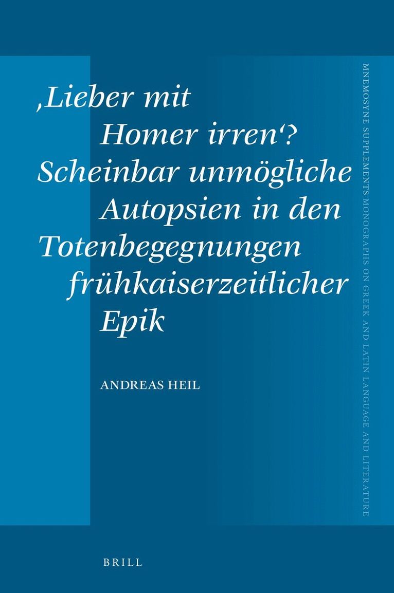 This monograph examines the literary representation of encounters between the living and the dead in Homer and the Roman epic poets of the early imperial period. The focus is on one particular situation: a witness to the afterlife (e.g. Odysseus or the Sibyl) who narrates encounters with the dead that he or she cannot (it would appear) actually have seen. This insufficiently studied and intriguing motif, namely seemingly impossible eye-witness testimony, can already be traced in Homer and then with variations in Vergil, the Culex poet, Lucan, Silius Italicus, and Statius.Die vorliegende Monographie untersucht die literarische Gestaltung von Begegnungen zwischen Lebenden und Toten bei Homer und den römischen Epikern der frühen Kaiserzeit. Im Mittelpunkt steht dabei eine besondere Situation: Ein Jenseitszeuge (z.B. Odysseus oder die Sibylle) berichtet von Begegnungen mit Toten, die er oder sie (scheinbar) nicht gesehen haben kann. Dieses unzureichend erforschte und faszinierende Motiv, nämlich die scheinbar unmögliche Autopsie, lässt sich bereits bei Homer und dann in Variationen bei Vergil, dem Culex-Dichter, Lucan, Silius Italicus und Statius nachweisen.