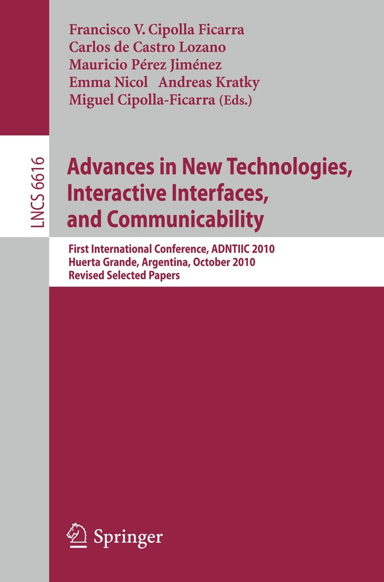 This book constitutes the thoroughly refereed post-conference proceedings of the First International Conference on Advances in New Technologies, Interactive Interfaces, and Communicability, held in Huerta Grande, Argentina, in October 2010. The 16 revised papers presented together with 3 keynote lectures were carefully reviewed and selected from numerous submissions. The topics addressed span the entire spectrum of design, e-commerce, e-learning, e-health, e-tourism, Web 2.0 and Web 3.0. and discuss the latest advances in the areas of accessibility, communicability, computer animation, computer science, database technologies, digital cartography, distance education, GIS, human factors, hypermedia, ICT, quality design, laboratory experience, medical informatics, multimedia, open software, software engineering, telecommunications, telework, tourism online, ubiquitous computing, user-centered design, and virtual reality.