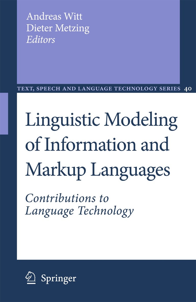 The general markup language XML has played an outstanding role in the mul- ple ways of processing electronic documents, XML being used either in the design of interface structures or as a formal framework for the representation of structure or content-related properties of documents. This book in its 13 chapters discusses aspects of XML-based linguistic information modeling combining: methodological issues, especially with respect to text-related information modeling, applicati- oriented research and issues of formal foundations. The contributions in this book are based on current research in Text Technology, Computational Linguistics and in the international domain of evolving standards for language resources. Rec- rent themes in this book are markup languages, explored from different points of view, and topics of text-related information modeling. These topics have been core areas of the research Unit "Text-technological Information Modeling" (www. te- technology. de) funded from 2002 to 2009 by the German Research Foundation (DFG).Positions developed in this book could also bene t from the presentations and discussion at the conference "Modelling Linguistic Information Resources" at the Center for Interdisciplinary Research (Zentrum fur .. interdisziplinare .. Forschung, ZiF) at Bielefeld, a center for advanced studies known for its international and interdisciplinary meetings and research. The editors would like to thank the DFG and ZiF for their nancial support, the publisher, the series editors, the reviewers and those people that helped to prepare the manuscript, especially Carolin Kram, Nils Diewald, Jens Stegmann and Peter M. Fischer and last but not least, all of the authors.