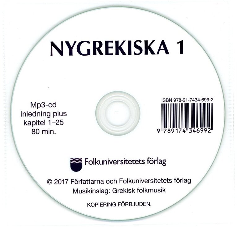 Mp3-cd med ljudinspelningar till läroboken Nygrekiska 1. 80 minuter med inledning plus 25 kapitel. Ljudet finns även på nätet.