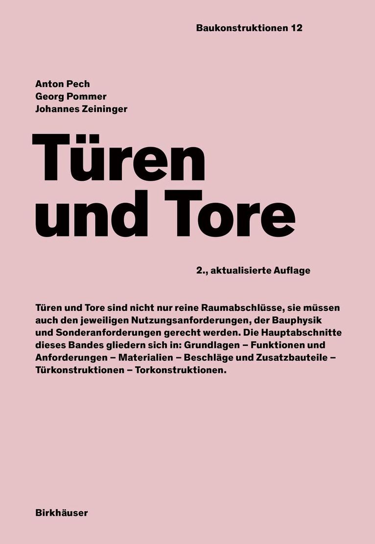 Der Band stellt den Einsatz von Außen- und Innentüren sowie Torkonstruktionen für den Wohn- und Geschäftsbereich dar. Die systematisch aufgebaute Einführung vermittelt Grundlagen, Funktionen und Anforderungen, Materialien, Beschläge und Zusatzbauteile und schließlich die gängigen Tür- und Torkonstruktionen. Behandelt werden Bauphysik, gebräuchliche Werkstoffe, Klimaschutzklassen und Funktionsweisen. Kapitel über Sonderkonstruktionen wie einbruchshemmende Türen, Schallschutz-, Brandschutz- und Schutzraumtüren sowie ein Kapitel über die Architektur ergänzen den Band. Die zweite Auflage wurde rundum aktualisiert: Beispiele, Normen und Berechnungen sind auf dem neuesten Stand.