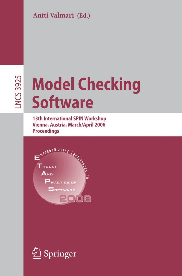 The name “SPIN” refers both to a workshopon model checking and to a famous model checking tool. The SPIN workshop is an annual forum for practitioners and researchersinterested in state space-based techniques for the validation and analysis of software and hardware systems, including communication protocols. It focuses on techniques based on explicit representations of state spaces, as implemented in the SPIN model checker or other tools, and techniques based on a combination of explicit representations with other representations. The SPIN model checker has proven to be particularly suited for the analysis of concurrent asynchronous systems. The workshop aims to encourage interaction and exchange of ideas with all related areas in software engineering. To promote interaction even further, many SPIN workshops have been held in conjunction with other meetings. The 13th International SPIN Workshop on Model Checking of Software was held in Vienna, Austria, co-located with the European Joint Conferences on Theory and Practice of Software (ETAPS) 2006. The earlier SPIN workshops were held in Montreal, Canada (1995); Rutgers University, USA (1996); Twente University, The Netherlands (1997); ENST, Paris, France (1998); Trento, Italy (1999); Toulouse, France (1999); Stanford University, USA (2000); Toronto, Canada (2001); Grenoble, France (2002); Portland, Oregon, USA (2003); Barcelona,Spain(2004);andSanFrancisco,USA(2005).Theproceedingsofthe Trento and Toulouse workshops were published together in Springer’s Lecture Notes in Computer Science volume 1680. From then on, each SPIN proceedings has been published as an individual LNCS volume.
