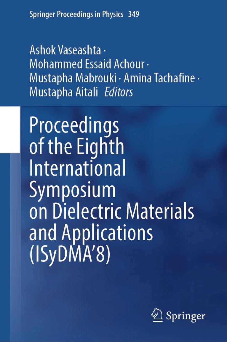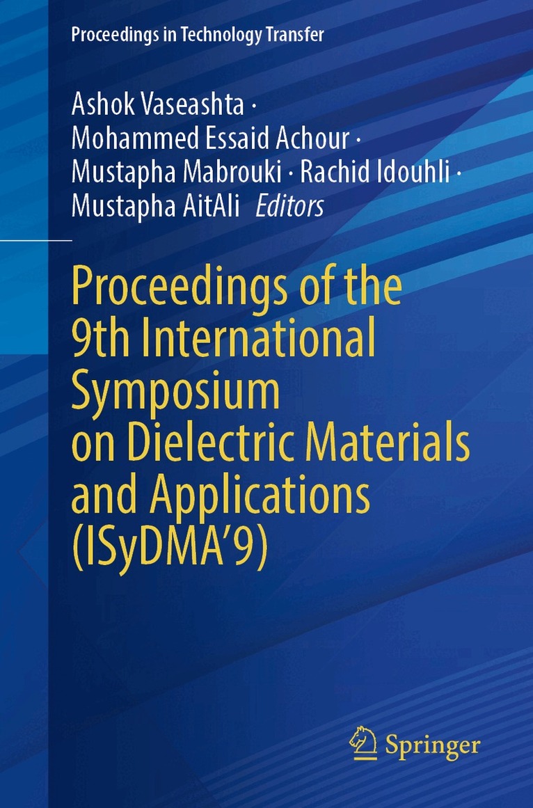 The International Symposium on Dielectric Materials and Applications (ISyDMA) conference series provides a distinguished global platform for researchers and scientists to exchange ideas, present findings, and engage in in-depth discussions on recent advances in dielectric materials and their emerging applications. The ISyDMA Proceedings volumes serve as comprehensive records of cutting-edge research on topics including high-κ dielectrics, electrical insulation, dielectric phenomena, and novel applications spanning biomedical technologies, energy harvesting, materials for critical infrastructure, and smart materials. The ninth edition of ISyDMA (ISyDMA’9) was hosted by Cadi Ayyad University, Marrakesh, Morocco, from May 7–9, 2025. This proceedings volume compiles the peer-reviewed papers presented at the conference. It opens with keynote contributions that offer overarching perspectives on mechanisms, processes, and applications of dielectric materials, followed by original research articles from participating scholars. Among the notable contributions, one study investigates how the structural self-organization of chalcogenide glasses influences low-frequency Raman scattering (Boson peaks), providing insights into the underlying mechanisms. Another article examines the impact of compositional variations and processing parameters on the optical characteristics of nonstoichiometric glassy films. Research on the parametric optimization of dielectric materials for energy harvesting in IoT devices demonstrates how systematic modeling can significantly reduce experimental trial-and-error in materials fabrication by identifying optimal process parameters. A study on microplasma-sprayed hydroxyapatite coatings illustrates enhanced surface bioactivity in 3D-printed titanium implants, underscoring their clinical promise for biomedical applications. Addressing environmental challenges, another contribution explores the use of dielectric barrier discharge as an innovative technique to mitigate microplastics in aquatic systems. Further, an article describes a photoacoustic method for evaluating the optical absorption coefficients of nanostructured silicon with varying morphologies, along with a comparative study of DC electrical conductivity in 2D and 3D polypyrrole particles embedded in different polymer matrices. Investigations into the synthesis, structural analysis, and dielectric properties of high-purity NiMoO₄ nanospheres with monoclinic symmetry reveal their potential for advanced electronic applications. A theoretical paper on the spectroscopy and electronic structure of group-12 metal carbides and nitrides provides critical insights to guide future experimental and computational studies of transition-metal-based diatomic materials. Several contributions highlight that moderate doping can significantly enhance the electrochemical performance of dielectric materials, demonstrating their suitability for next-generation energy storage systems. An interesting work discusses Poly(vinylidene fluoride) membranes fabricated via non-solvent-induced phase separation and modified with styrene–butadiene rubber and graphene nanosheets. The resulting β-phase-rich, polarizable structures exhibit tunable electronic conductivity, making them attractive for piezoelectric energy harvesting applications. Additional articles address the integration of AI in energy management and consumption optimization, as well as applications such as high-efficiency photodetectors based on optically transparent and dielectric materials for monitoring hazardous substances in mail distribution systems. The volume also includes several student contributions highlighting innovative aspects of dielectric science and its interdisciplinary applications. The unique collection of articles is intended for materials scientists, physicists, chemists, biologists, and electrical engineers engaged in fundamental and applied research or technical investigations involving dielectric materials and related technologies. The International Symposium on Dielectric Materials and Applications (ISyDMA) conference series provides a distinguished international platform for researchers to exchange ideas, present findings, and discuss recent advances in dielectric materials and their emerging applications. The ISyDMA Proceedings volumes document state-of-the-art research spanning high-κ dielectrics, electrical insulation, dielectric phenomena, and novel applications in biomedical technologies, energy harvesting, materials for critical infrastructure, and smart materials. The ninth edition of ISyDMA (ISyDMA’9) was hosted by Cadi Ayyad University, Marrakesh, Morocco, from May 7–9, 2025. This volume compiles peer-reviewed papers presented at the conference, starting with keynote contributions that offer broad perspectives on the mechanisms, processes, and applications of dielectric materials, followed by original research articles. Highlights include studies on the structural self-organization of chalcogenide glasses and its effect on low-frequency Raman scattering (Boson peaks), and on how compositional and process variations influence the optical characteristics of nonstoichiometric glassy films. Research on parametric optimization of dielectric materials for IoT energy harvesting demonstrates how modeling can minimize trial-and-error in fabrication. A study on microplasma-sprayed hydroxyapatite coatings reveals enhanced bioactivity in 3D-printed titanium implants, while another explores dielectric barrier discharge techniques for mitigating microplastics in aquatic systems. Further contributions include a photoacoustic method for measuring optical absorption in nanostructured silicon, a comparative study of DC conductivity in 2D and 3D polypyrrole composites, and investigations of nanospheres exhibiting monoclinic symmetry with promising dielectric performance. A theoretical analysis of metal carbides and nitrides offers valuable insights fo