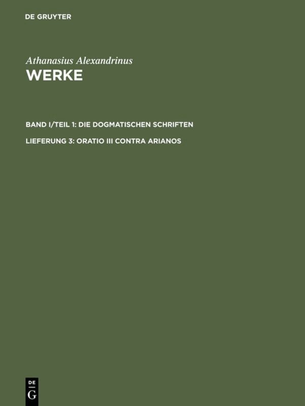 A text-critical edition of the third speech against the Arians (in Greek) within the Berlin edition of Athanasius Werke.The edition presents the third speech against the Arians, which the Alexandrian bishop Athanaius composed probably between 342-345 CE. The new critical edition of this writing, which because of its dogmatic statements on Christology was often later cited in secondary sources, takes the place of Bernard de Montfaucon’s edition of 1698 and the various reprints of it.