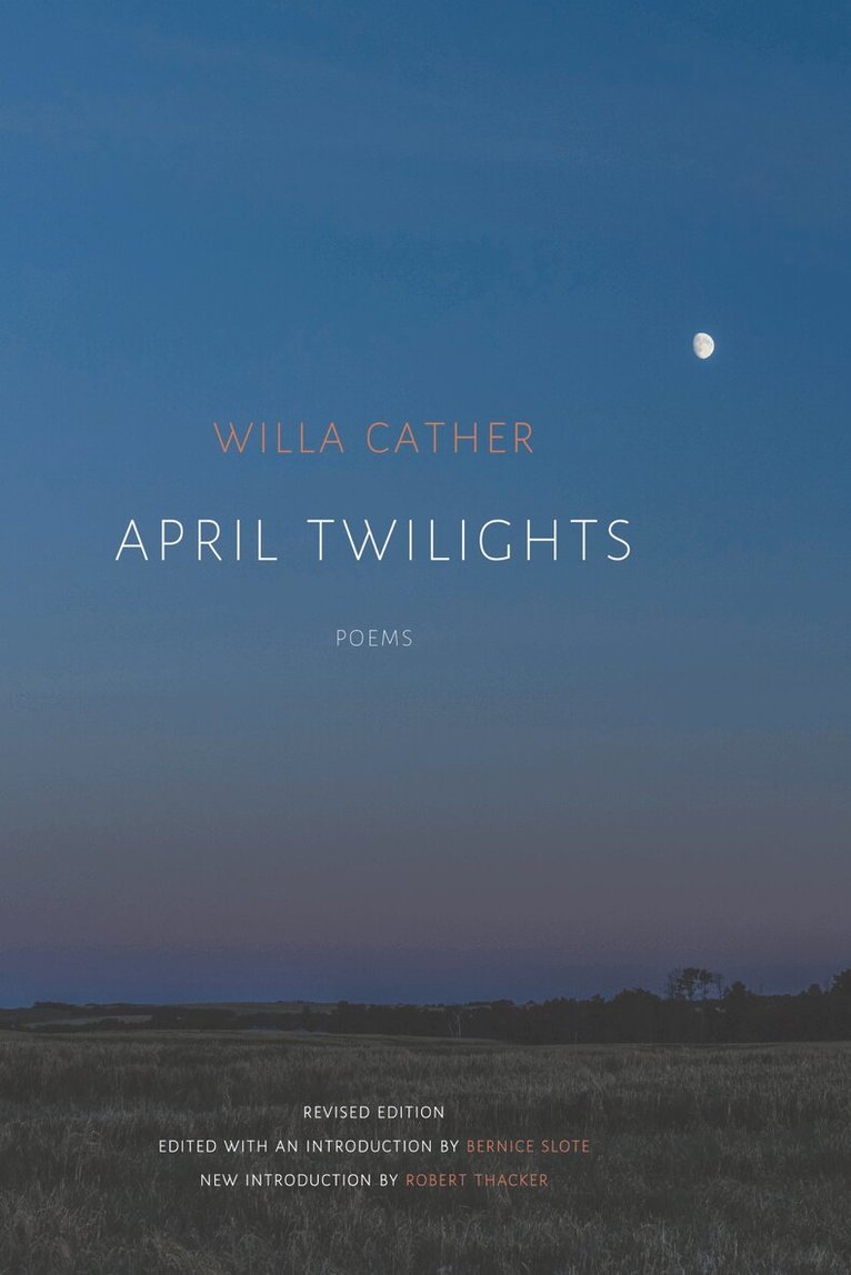 Before Willa Cather turned primarily to the fiction that made her reputation, she produced striking poems that were collected in April Twilights. It was her literary debut, preceding the publication of O Pioneers! by nine years. In her introduction distinguished Cather scholar Bernice Slote notes that this edition of April Twilights restores what had been “an almost lost, certainly blurred, portion of the creative life of a great novelist.”Among the thirty-seven selections are the much-anthologized “Grandmither, Think Not I Forget” and the highly evocative “Prairie Dawn.”This printing includes a new introduction by Robert Thacker that provides new insights into Cather and her poetry.