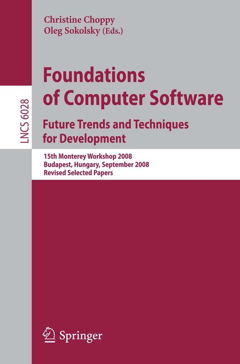 This volume contains revised and expanded versions of the papers presented at th the 15 Monterey Workshop, held during September 24-26, 2008 in Budapest, Hungary. The Monterey Workshops series was initiated in 1993 by Dr. David Hislop, a longtime program manager at the U. S. Army Research O?ce, with the purpose of exploring the critical problems associated with cost-e?ective development of high-qualitysoftwaresystems. During their 15-yearhistory,the MontereyWo- shops have brought together scientists that share a common interest in software development research serving practical advances in next-generation softwa- intensive systems. Each year is dedicated to a particular topic of critical - portance. In recent years, workshop topics were "Innovations for Requirement Analysis: From Stakeholders Needs to Formal Designs" (2007 in Monterey, C- ifornia), "Composition of Embedded Systems, Scienti?c and Industrial Issues" (2008inParis,France),"NetworkedSystems:RealizationofReliableSystemson Unreliable NetworkedPlatforms" (2005in Laguna Beach,California), "Software Engineering Tools: Compatibility and Integration"(2004 in Vienna, Austria), "Engineering for Embedded Systems: From Requirements to Implementation" (2003 in Chicago, Illinois), "Radical Innovations of Software and Systems En- neering in the Future" (2002 in Venice, Italy).The topic of the 2008 workshop was "Foundations of Computer Software, Future Trends and Techniques for Development. " Modern computer systems manage very large amounts of information, performing complex computations in a distributed way. At the same time, there is a need to display information in a way that aids human actors in the interpretation of this information and in decision making.