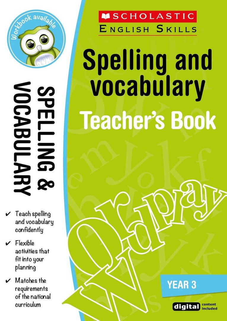 "A really useful classroom resource." Mrs J. Holloway,Amazon customer.Help children master core English skillsrequired for success at school and beyond. Matched to the curriculum,our acclaimed Scholastic English Skills seriesis full of easy ways to teach the essentials. An idealEnglish toolkit for the primary yearsGets children speaking,reading and writing confidentlyTackles common problemsthat hold back progressSaves time with inspiring ready-madelesson ideas, activities and postersIncludes detailedbackground knowledge and teacher notesThe CD-ROMcontains interactive activities for the whiteboard, perfect forstarter or plenary activitiesThis spelling and vocabularyteacher's book covers rules and exceptions, word families,prefixes and suffixes, tricky spellings and much more. A linkedpupil workbook is also available.