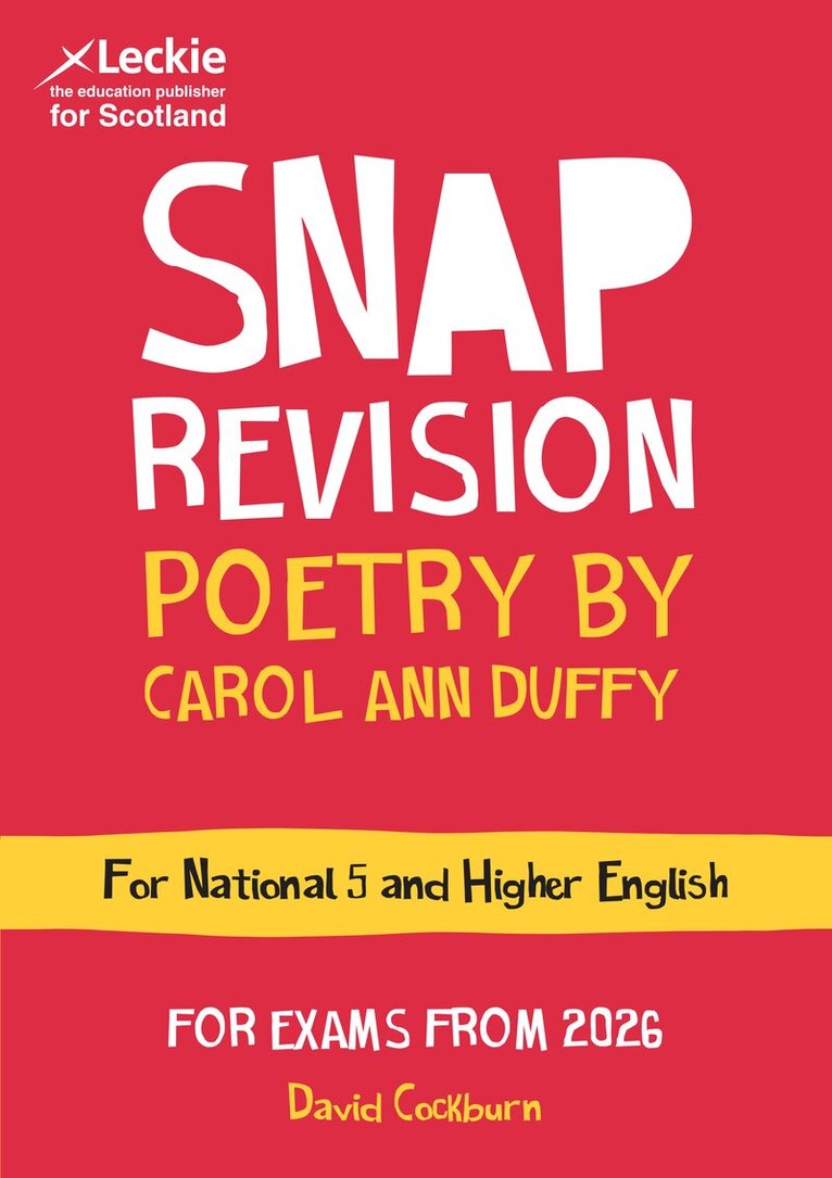 Exam Board: SQA Level: N5/Higher Subject: English Suitable for exams from 2026 Updated to include the poems from the Scottish set text list for 2025/26 onwards.Need extra help with English Poetry by Carol Ann Duffy? Revise National 5 and Higher English in a snap with Leckie SNAP Revision! Revise and review your understanding of themes, structure and poetic techniques with this handy, exam-focused guide. First, different poems are analysed using colour-coded sections that are easy-to-read. Next, common themes and techniques are discussed so you know exactly what to look for on the day of your SQA English exam. Finally, put your knowledge to the test with plenty of exam practice, followed by answers that allow you to check your understanding. With lots of top tips included throughout, this SQA English revision guide has all the tools you need to get a top mark! Revise SQA English in a snap with Leckie SNAP Revision: Poetry by Norman MacCaig () and Reading for Understanding, Analysis and Evaluation (9780008306663).