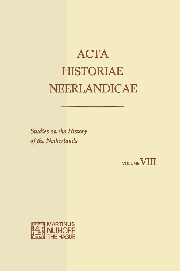Volume VIII of Acta Historiae Neerlandicae again presents studies on the history of the Low Countries which it is hoped will be of interest to foreign scholars. The intention has been to deal with a fairly long period, and many differing aspects, of the subject. So institutional, political, economic, social and cultural history all receive a fair share of attention, and together the studies cover a considerable number of centuries. It is, however, striking to note how even this restricted number of studies reflects prevailing viewpoints among today's Low Countries' historians. Clearly there is considerable stress on economic and social questions. Traditional studies such as those of former Belgian historians on medieval history, or those of the Dutch on the seventeenth century, are now giving way to works that are problem directed. Power structures, the position of the bourgeoisie, reactions of the intelli gentsia and theologians to societal problems, have now more attraction for scholars than the glories of late medieval wealth in Flanders or Holland's Golden Age. Terms such as Guerilla warfare, Struggle, Depression, typify today's critical approach to society in general.