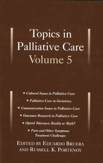 The rapidly evolving field of Palliative Care focuses on the management of phenomena that produce discomfort and that undermine the quality of life of patients with incurable medical disorders. The interdisciplinary clinical purview includes those factors - physical, psychological, social, and spiritual - that contribute to suffering, undermine the quality of life, and prevent a death with comfort and dignity. Palliative Care is a fundamental part of clinical practice, the "parallel universe" to therapies directed at cure or prolongation of life. All clinicians who treat patients with chronic life threatening diseases are engaged in palliative care, continually attempting to manage complex symptomatology and functional disturbances. The scientific foundation of palliative care is advancing, and similarly, methods are needed to highlight, for practioners at the bedside, the findings of empirical research. Topics in Palliative Care Series is divided into sections that address a range of issues. Addressing aspects of sumptom control, psyshocsoical functioning, spiritual or existential concerns, ethics, and other topics, the chapters in each section review the given area and focus on a small number of salient issues for analysis. The authors present and evaluate existing data, provide a context drawn from clinical and research settings, and integrate knowledge in a manner that is both practical and readable. The specific topics covered in Volume 5 are Cultural issues in Palliative Care, Palliative Care in Geriatrics, Communication Issues in Palliative Care, Outcomes Research in Palliative Care, Opiod Tolerance; Reality of Myth?, and Pain and other symptoms: Treatment Challenges.