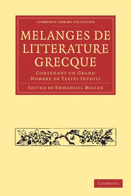 Emmanuel Miller (1812-1886) published Mélanges de Littérature Grecque, perhaps his most important work, in 1867. The volume is a collection of Greek lexicographical texts, proverbs and hymns. It includes large sections of the Etymologicum Genuinum, a ninth-century lexical encyclopaedia compiled in Constantinople under the supervision of Photius. The text is the recension found in the tenth-century manuscript Laurent. S. Marci 304 (B). The volume includes Miller's collation of B against Gaisford's 1848 edition of the Etymologicum Magnum, revealing the strong textual consanguinity between the two lexicons. The volume includes shorter texts including excerpts from the Etymologicum Parvum; compilations of proverbs from authors such as Zenobius, Didymus of Alexandria, and Aristophanes of Byzantium; and a selection of Orphic hymns. Miller made many of these texts available the first time, opening the way for critical study, and the volume made an important contribution to the understanding of Byzantine scholarship.