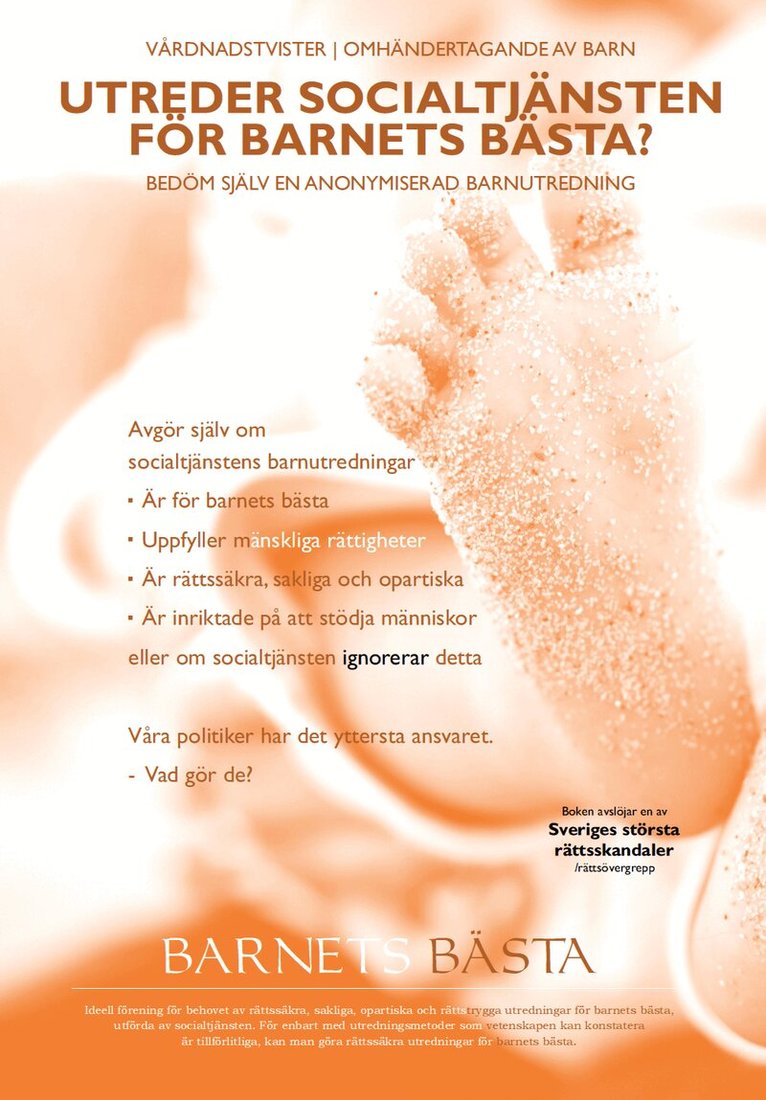 Media har avslöjat hur barn kan skiljas från en eller båda sina föräldrar utan orsak i vårdnadstvister och vid tvångsomhändertaganden. Varför? För att socialtjänsten inte gör rättssäkra utredningar. Istället är de osakliga och partiska. Media har även avslöjat att barn som borde tvångsomhändertas inte tvångsomhändertas. Trots att barnen är utsatta för vanvård, våld och sexuella övergrep. Varför? För att socialtjänsten inte gör rättssäkra utredningar. Många föräldrar protesterar över att socialtjänstens inte gör rättssäkra utredningar - istället är de osakliga och partiska. Men socialtjänsten hävdar att deras utredningar är korrekta. Vad är sant? Nu kan du själv avgöra om socialtjänstens utredningar är rättssäkra, om de är inriktade på att stödja människor och på att ta hänsyn till barnets bästa. För det kräver våra lagar och det tror många att socialtjänsten följer i sina utredningar. Nu kan du själv avgöra om det stämmer för i den här boken har vi anonymiserat en barnutredning som är representativ för de 24 utredningar vi granskat och i överensstämmelse med de över 400 utredningarna som experter granskat. En fördel är att boken pedagogiskt visar och förklarar hur vetenskaplig utredningsmetodik är nödvändig för utredningars rättssäkerhet, saklighet och opartiskhet. Det är annars svårt att förstå. Detta gör vi utifrån ”Barnets bästa-kollen”, en särskilt framtagen granskningsmetod för socialtjänstens barnutredningar som är baserad på vetenskapen inom området. Dessutom lär du dig att själv avgöra om ett barns utredning är rättssäker eller inte med ”Barnets bästa-kollen”. Boken och Barnets bästa-kollen är en utmärkt gör-det-själv metod för alla berörda föräldrar, mor– och farföräldrar. Den är även viktig för alla kommunpolitiker som enligt lag har det yttersta ansvaret för sin kommuns socialtjänst. Förträfflig för advokater och domare i vårdnadstvister och mål om barnomhändertagande. Utomordentlig för ansvariga rikspolitiker, tjänstemän på Inspektionen för vård och omsorg (IVO) och socialstyrelsen. Boken är också värdefull kurslitteratur på socionomutbildningar samt ett hjälpmedel för journalister och för alla som vill få en snabb inblick i vad som krävs för att en socialtjänsts barnutredning ska uppfylla ett minimum av rättssäkerhet, saklighet och opartiskhet.
