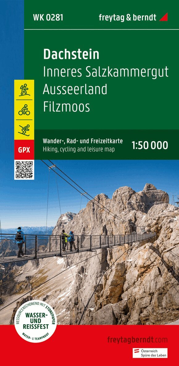 The Pyhrn-Priel hiking, cycling and leisure time map on a scale of 1:50,000 should always be in your luggage when excursions, hiking and cycling tours in one of the most well-known holiday regions in Upper Austria are on the agenda! The Kalkalpen National Park, in particular, fascinates visitors with its closed forest areas and impressive biodiversity. The hiking map also presents the Steyr Valley, which can be explored comfortably along the Steyr Valley Cycle Path, and the tourism region of Traunsee-Almtal further west, which is also known as the eastern ?gateway? to the Salzkammergut. Information on the Pyhrn-Priel hiking map Hiking and long-distance hiking trails via ferratas Scale 1:50,000 Waterproof and tear resistant Cycle paths and mountain bike trails Attractive excursion destinations 70 x 82 cm, printed on both sides GPX Tracks zum Download With info guide The numerous existing regional hiking trails are supplemented by several long-distance hiking and pilgrimage trails, including the Northern Alpine Trail, the Mariazeller Trail, the Salzsteig and the Via Alpina. The Almuferweg between the Almspitz and the Almsee is particularly suitable for pleasure hikers, while the demanding Salzkammergut BergeSeen Trail with its 20 stages lets you experience the most beautiful sides of the Salzkammergut with its impressive peaks and the lakes in between. The hiking trails on the map are easy to follow thanks to the exact cartography by freytag & berndt and the ideal scale. Demanding passages such as climbs with climbing points are of course marked on the map. The Pyhrn-Priel hiking map is also an ideal companion for cyclists and mountain bikers . The courses of the Steyrtal Cycle Path, the Kremstal Cycle Path and the Almtal Cycle Path can be followed just as easily as the mountain bike routes, which lead to sweaty heights and bring rapid descents with them. Info guide The 'short and compact' info guide not only provides a brief overview of the region, but also presents the Kalkalpen National Park in more detail. Anyone who would like to find out more about its species-rich fauna and flora should pay a visit to the national park center in Molln or go to the Wurbauerkogel, where a panorama tower offers an incomparable panoramic view. On hot summer days, the Traunsee and the Almsee invite you to take a dip in the cool water, while in Gmunden visitors stroll along the Esplanade. The Gassel stalactite cave and the Cumberland wildlife park in Grünau are also attractive destinations for the whole family. In order to follow in the footsteps of Emperor Franz Joseph I, a visit to the picturesque Offensee at the foot of the Rinnerkogel is a must. Waterproof and tear-resistant The map is printed on a special waterproof and durable paper so that it can also be used for orientation on rainy days. Resource-saving production The map consists of 80% ground limestone. The production is much more resource-saving than with conventional paper because the consumption of water, wood and energy is significantly lower.