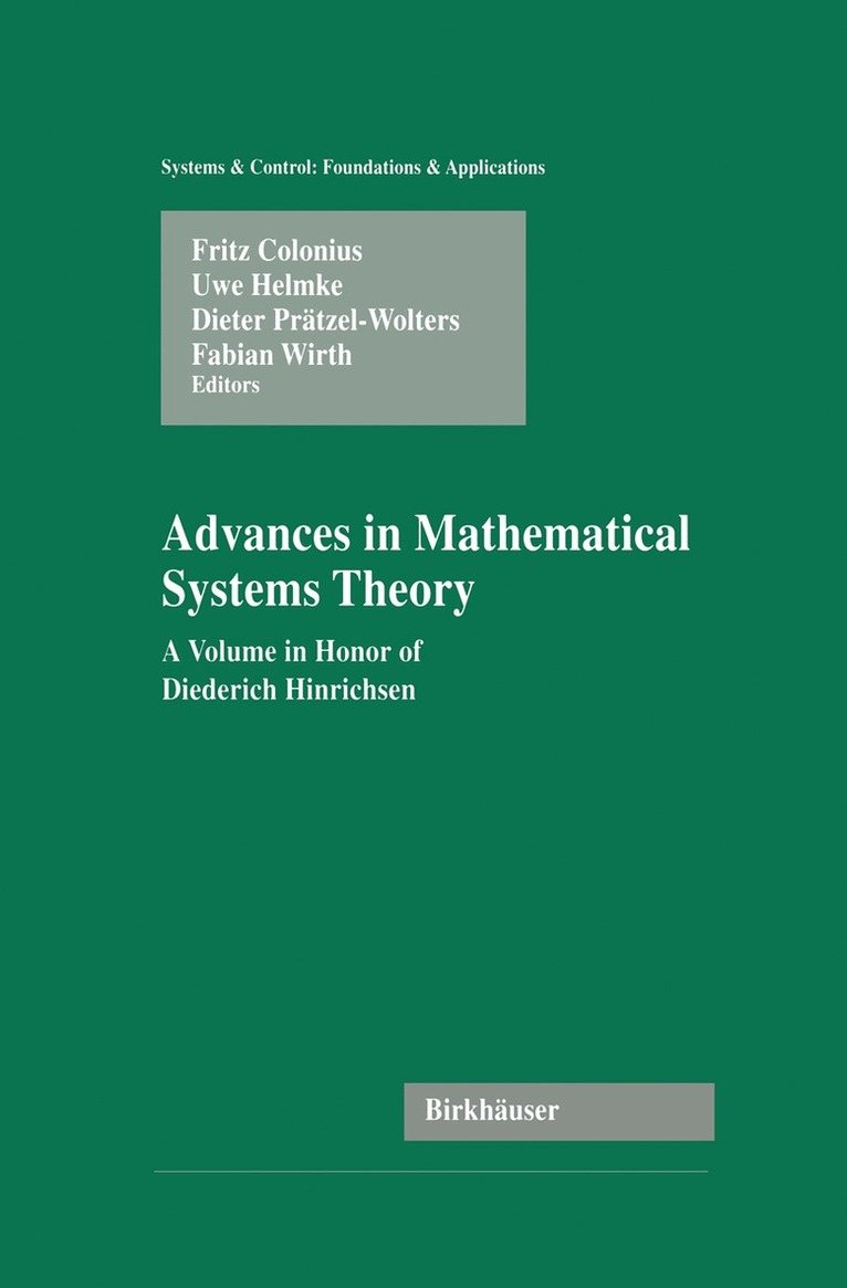 This volume contains the lectures presented at the workshop on "Advances in Mathematical Systems Theory," held on the island of Borkum, Germany (April 20-23, 1999). The book will be of interest to graduate students and researchers interested in control theory and mathematical systems theory, who will find in-depth analysis and presentations from diverse perspectives interacting in this lively area. The editors are proud to dedicate this volume to Diederich Hinrichsen on the occasion of his 60th birthday in acknowl- edgment of his major contributions to linear systems theory and control theory and his long-term achievements in establishing mathematical sys- tems theory in Germany. We all owe much to him as a teacher, colleague, and friend. The editors thank the Graduiertenkolleg "Komplexe Dynamische Sys- teme" at the University of Bremen as well as the European "Nonlinear Control Network" for providing financial support that enabled this work- shop.Augsburg, Germany Fritz Colonius Wiirzburg, Germany Uwe Helmke Kaiserslautern, Germany Dieter Pratzel-Wolters Bremen, Germany Fabian Wirth Introduction The workshop "Advances in Mathematical Systems Theory" took place in honor of Diederich Hinrichsen on the occasion of his 60th birthday. The following chapters are based on invited lectures and cover a wide range of topics in linear and nonlinear systems theory including parameteriza- tion problems, behaviors of linear systems and convolutional codes, as well as complementarity systems and hybrid systems.