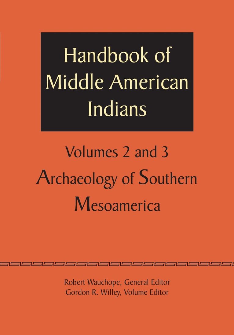 Archaeology of Southern Mesoamerica comprises the second and third volumes in the Handbook of Middle American Indians, published in cooperation with the Middle American Research Institute of Tulane University under the general editorship of Robert Wauchope (1909–1979). The volume editor is Gordon R. Willey (1913–2002), Bowditch Professor of Mexican and Central American Archaeology and Ethnology at Harvard University. Volumes Two and Three, with more than 700 illustrations, contain archaeological syntheses, followed by special articles on settlement patterns, architecture, funerary practices, ceramics, artifacts, sculpture, painting, figurines, jades, textiles, minor arts, calendars, hieroglyphic writing, and native societies at the time of the Spanish conquest of the Guatemala highlands, the southern Maya lowlands, the Pacific coast of Guatemala, Chiapas, the upper Grijalva basin, southern Veracruz, Tabasco, and Oaxaca. The Handbook of Middle American Indians was assembled and edited at the Middle American Research Institute of Tulane University with the assistance of grants from the National Science Foundation and under the sponsorship of the National Research Council Committee on Latin American Anthropology.