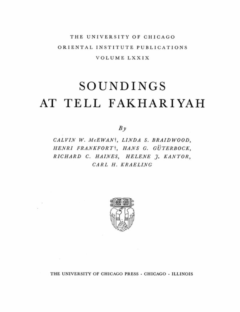 An imposing array of scholars have united to pay a debt of piety to the late C. W. McEwan, whose untimely death in 1950 forestalled the publication of his campaign at Tell Fakhariyah, which took place in 1940. That the important results obtained by McEwan have thus been rescued is greatly to the credit of the editor and director of the Oriental Institute, Carl H. Kraeling, and the architect R. C. Haines, who prepared for publication the highly competent but necessarily incomplete topographic and architectural data assembled in the field by the late Harold D. Hill.