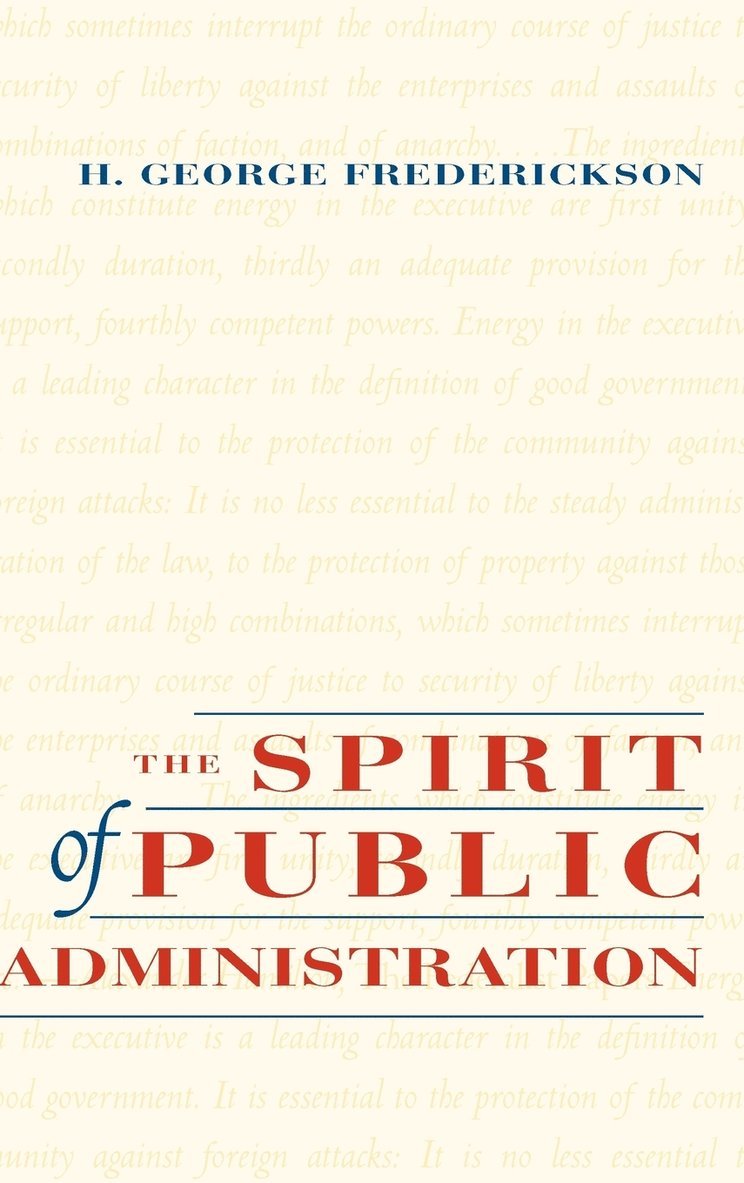 In this field-defining, broad approach to the study and practice of public administration, H. George Frederickson, one of the field's most respected scolars, carefully measures the meets and bounds of public administration and fixes its place in the context of changing politics, values, and ethics. He describes a robust and exciting public administration that includes, but is much more than, effective government management. The Spirit of Public Administration defines an ethic for the field that illustrates:* What the differences are between public administration and government administration, and how these differences redefine the field* How to practice ethical and energetic public administration in the context of contemporary politics* Why fairness and benevolence are as important as efficiency and economy* What implications are evident in the transition from government to governanceFrederickson strongly defAnds broad grants of discretion to public administrators and then lays out the proper norms and ethic which should inform that discretion. And he firmly argues that the effectiveness of democratic government and modern governance, not just for the majority of but for all citizens, depAnds on the energetic exercise of bureaucratic discretion. The book concludes with seven principles that should guide everyone who works in public settings. Students and scholars will find The Spirit of Public Administration an exhilarating and challenging perspective.