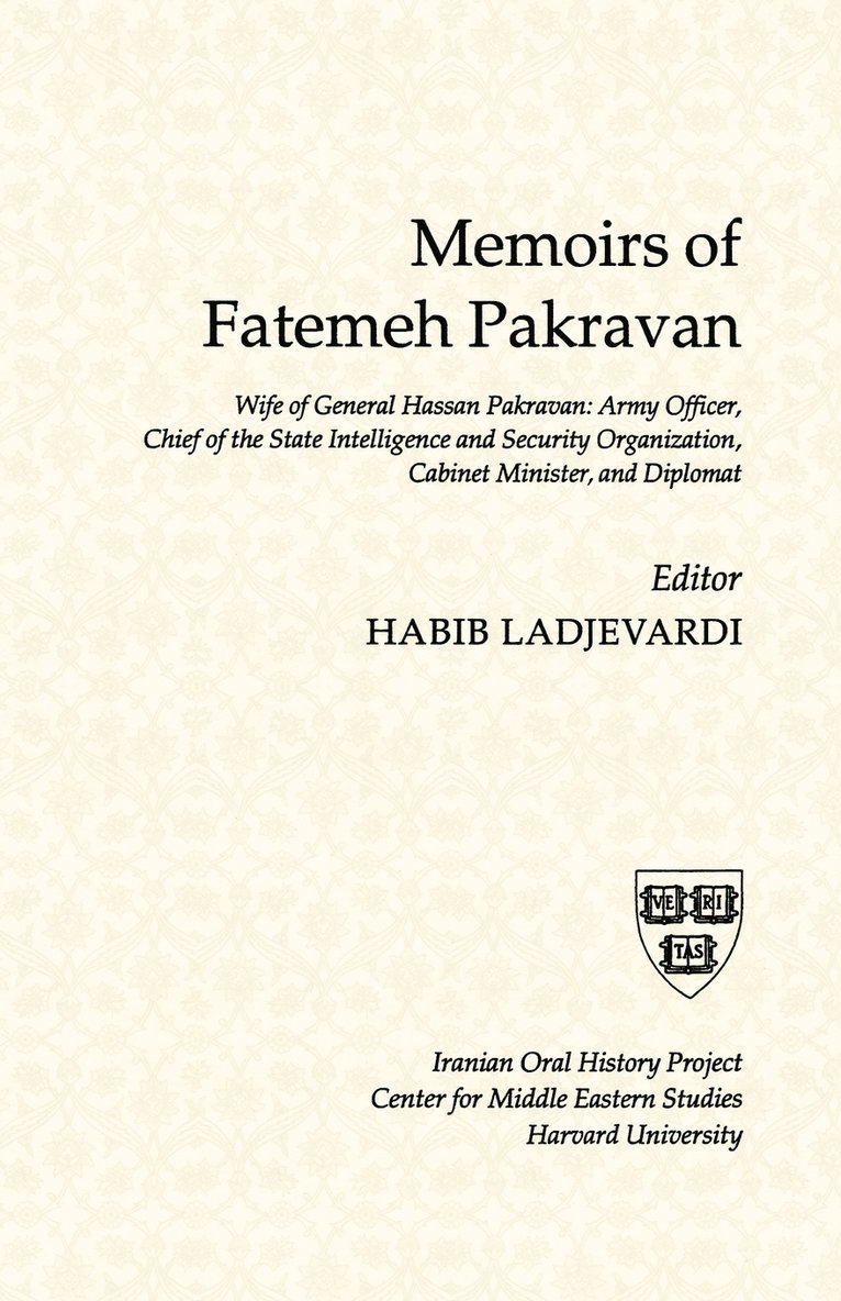 Harvard Iranian Oral History Project memoirs of the wife of General Hassan Pakravan, who was the head of Iranian intelligence during Khomeini's first uprising in 1963. He was executed by the Islamic Republic shortly after the 1979 revolution. It provides fascinating details of the workings of the elite during the reign of Mohammad-Reza Pahlavi.