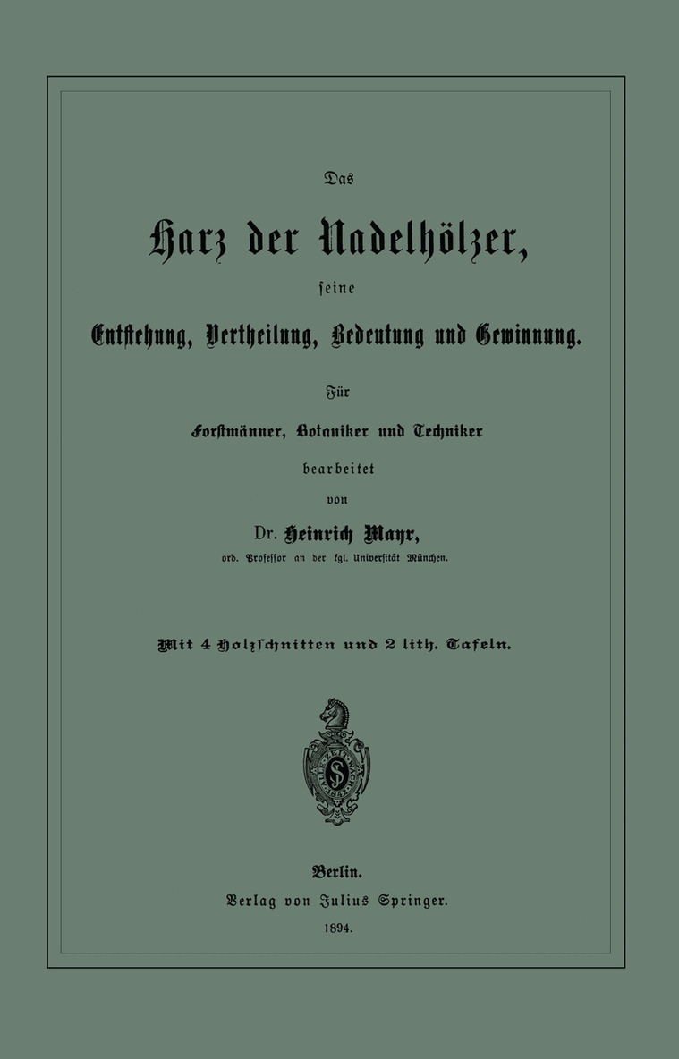 Das Harz der Nadelhölzer, seine Entstehung, Vertheilung, Bedeutung und Gewinnung. Für Forstmänner, Botaniker und Techniker