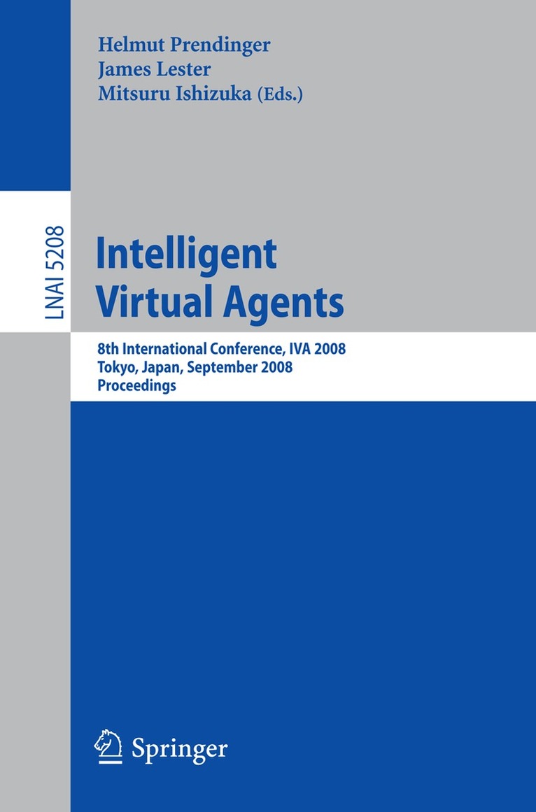 This book constitutes the refereed proceedings of the 8th International Workshop on Intelligent Virtual Agents, IVA 2008, held in Tokyo, Japan, in September 2008. The 18 revised full papers and 28 revised short papers presented together 42 poster papers were carefully reviewed and selected from 99 submissions. The papers are organized in topical sections on motion and empathy; narrative and augmented reality; conversation and negotiation; nonverbal behavior; models of culture and personality; markup and representation languages; architectures for robotic agents; cognitive architectures; agents for healthcare and training; and agents in games, museums and virtual worlds.