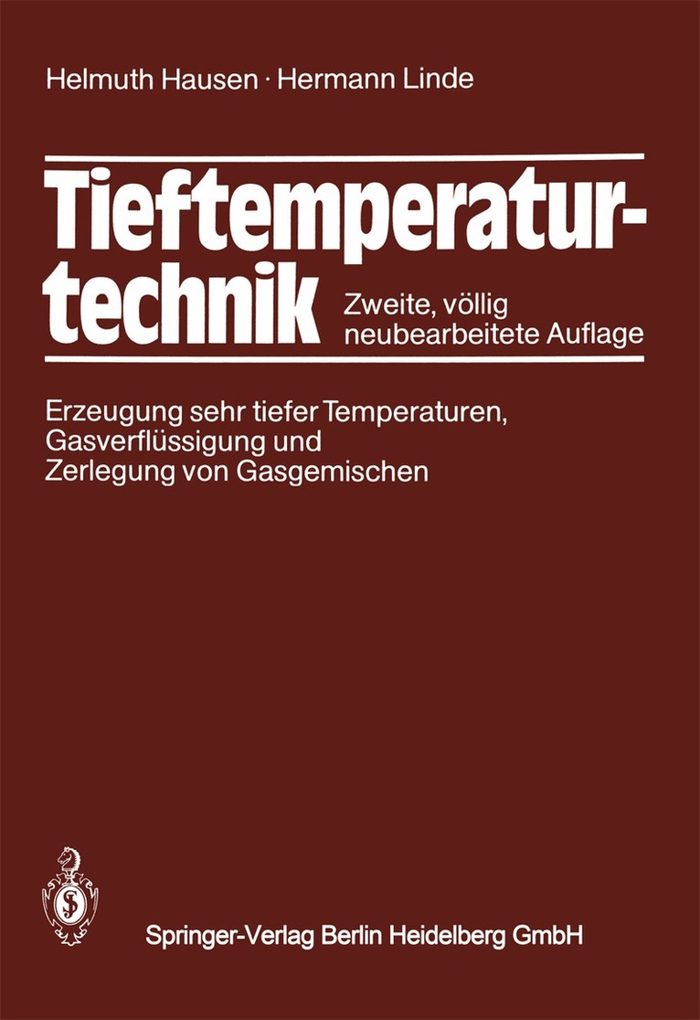 Das vorliegende Buch, dessen ursprünglicher Haupttitel "Erzeugung sehr tiefer Temperaturen" in "Tieftemperaturtechnik" umgeändert worden ist, behandelt nach wie vor im wesentlichen den Temperaturbereich zwischen -100°C und dem absoluten Nullpunkt von -273,15 oe. Es stellt die physikalischen Grundlagen der Tieftem peraturtechnik, die Funktionsweise und die praktische Gestaltung und der Tieftem peraturanlagen sowie die vielseitigen technischen Anwendungen dar. Die I. Auflage, die 1957 als Band VIII des von Rudolf Plank herausgegebenen Handbuchs der Kälte technik erschienen ist, war im Jahre 1967 früher als alle anderen Bände dieses Hand buchs vergriffen. Der weiter bestehenden Nachfrage und dem eigenen Wunsch ent sprechend, hoffte der erste der bei den Verfasser, bald eine neue Auflage bearbeiten zu können. Aber zahlreiche andere Verpflichtungen hielten ihn hiervon ab. Für die erste Auflage standen ihm die Erkenntnisse und Erfahrungen zur Ver fügung, die er sich bei seiner 28jährigen Tätigkeit bei der Linde AG in Höllriegels kreuth bei München erworben hatte. Von 1950 an hingegen konnte er die Weiter entwicklung der Tieftemperaturtechnik nur noch am Rande verfolgen. Außerdem hätten bei seinem nunmehr bis zu 89 Jahren fortgeschrittenen Alter die Kräfte nicht mehr ausgereicht, ein solches Buch allein zu bearbeiten. Einer Bitte des ersten Ver fassers folgend, hat Hermann Linde, Enkel von Carl von Linde, sich bereit erklärt, bei der Bearbeitung der neuen Auflage mitzuwirken. Er war von 1949 bis 1976 bei der Linde AG tätig, dabei längere Zeit als das für die Tieftemperatur-und Verfahrens technik zuständige V orstandsmi tglied.