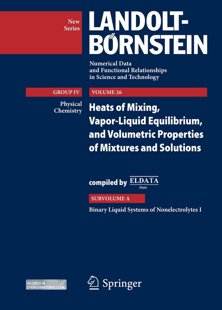 Vapor-liquid equilibrium data, heat of mixing (excess enthalpies), and volumetric properties of systems are required for both the applications in design of industrial technological processes and the understanding the structure and the intermolecular interactions in the systems. On the basis of classical thermodynamics the measured experimental data combined together enable us the calculation of non-measurable thermodynamic properties significant for the technological calculations. The present volume is a compilation of experimental and derived property data on subcritical binary homogeneous (single-phase) or heterogeneous (two-phase) liquid–liquid mixtures. All the components are well-defined pure substances, which are organic nonelectrolytes and water. Only data obtained by, or derived from, direct experimental measurements are considered.The present Subvolume A reproduces in tables and graphs the numerical values for 800 binary mixtures (out of a total of 2846 systems). The remainder is published in Subvolumes B and C.