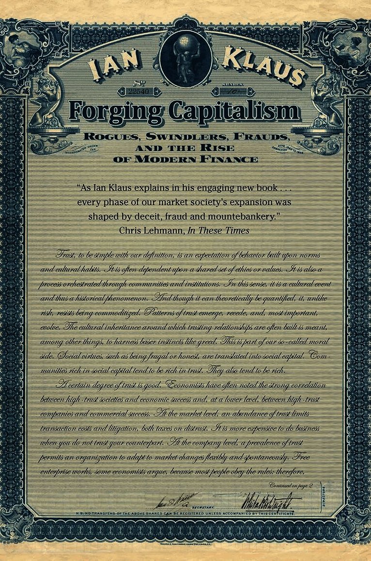 A riveting history of raw capitalism that exposes the unscrupulousness at its heartVice is endemic to Western capitalism, according to this fascinating, wildly entertaining, often startling history of modern finance. Ian Klaus’s Forging Capitalism demonstrates how international financial affairs in the nineteenth century were conducted not only by gentlemen as a noble pursuit but also by connivers, thieves, swindlers, and frauds who believed that no risk was too great and no scheme too outrageous if the monetary reward was substantial enough. Taken together, the grand deceptions of the ambitious schemers and the determined efforts to guard against them have been instrumental in creating the financial establishments of today. In a story teeming with playboys and scoundrels and rich in colorful and amazing events, Klaus chronicles the evolution of trust through three distinct epochs: the age of values, the age of networks and reputations, and, ultimately, in a world of increased technology and wealth, the age of skepticism and verification. In today’s world, where the questionable dealings of large international financial institutions are continually in the spotlight, this extraordinary history has great relevance, offering essential lessons in both the importance and the limitations of trust.