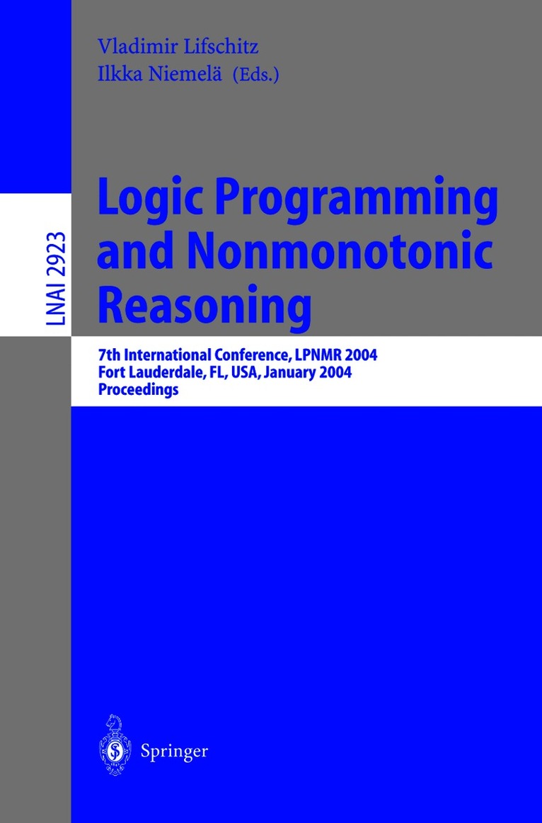 The papers in this collection were presented at the 7th International Con- rence on Logic Programming and Nonmonotonic Reasoning (LPNMR-7) in Fort Lauderdale, Florida, USA, during January 6-8, 2004. The previous meetings in this series were held in Washington, DC, USA (1991), Lisbon, Portugal (1993), Lexington, USA (1995), Dagstuhl, Germany (1997), El Paso, USA (1999), and Vienna, Austria (2001). LPNMR conferences are a forum for exchanging ideas on declarative logic programming, nonmonotonic reasoning and knowledge representation. In the 1980sresearchersworkingintheareaofnonmonotonicreasoningdiscoveredthat their formalisms could be used to describe the behavior of negation as failure in Prolog,andthe?rstLPNMRmeetingwasconvenedforthepurposeofdiscussing thisrelationship.Thisworkhasledtothecreationoflogicprogrammingsystems of a new kind, answer set solvers, and to the emergence of a new approach to solving combinatorial search problems, called answer set programming. The highlights of LPNMR-7 were three invited talks, given by Rina Dechter (University of California, Irvine), Henry Kautz (University of Washington) and Torsten Schaub (University of Potsdam).The program also included 24 regular papers selected after a rigorous review process, 8 system descriptions, and 2 panels. We would like to thank the Program Committee members and additional reviewers for careful, unbiased evaluation of the submitted papers. We are also grateful to Paolo Ferraris for help with publicizing the Call for Papers, to Fred Ho?man for help with local organizational matters, and to Matti J.. arvisalo for help with the organization of the electronic Program Committee meeting.