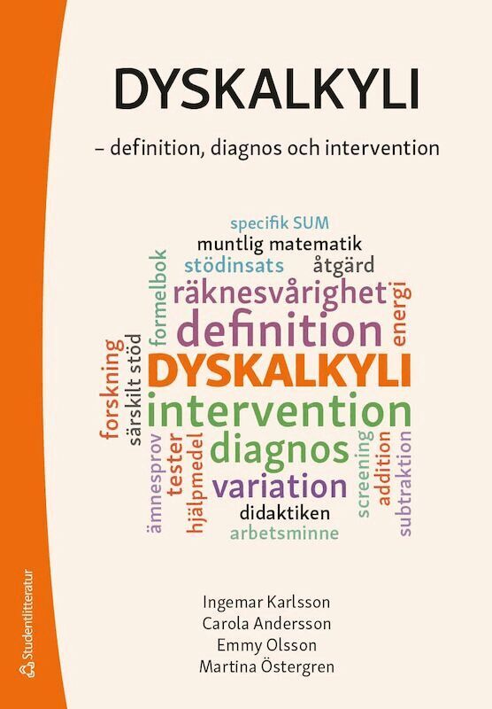 Syftet med denna bok är att ge en bild av vad begreppet dyskalkyli egentligen omfattar.Ingemar sätter konsensusdokumentet ”The diagnosis and treatment of dyscalculia” (Haberstroh & Schulte-Körne 2019) i fokus för sin framställning. Dokumentet beskriver var forskningen står i dag, och det är dessutom inriktat mot den praktik som verkställer diagnos och behandling av dyskalkyli på vetenskapliga grunder.Det unika med denna bok är också att matematiklärare presenterar en metodik som visar sig vara verksam när det gäller att få en elev med dyskalkyli att bli godkänd i matematik. Eleven Emmy Olsson berättar om sin diagnos dyskalkyli. Matematikläraren Martina Östergren samt studerandeassistenten Carola Selerup Andersson redogör för hur det går till att undervisa Emmy till ett gott resultat med nya, okonventionella metoder.Bokens målgrupp är främst matematiklärare, skolledare och speciallärare.