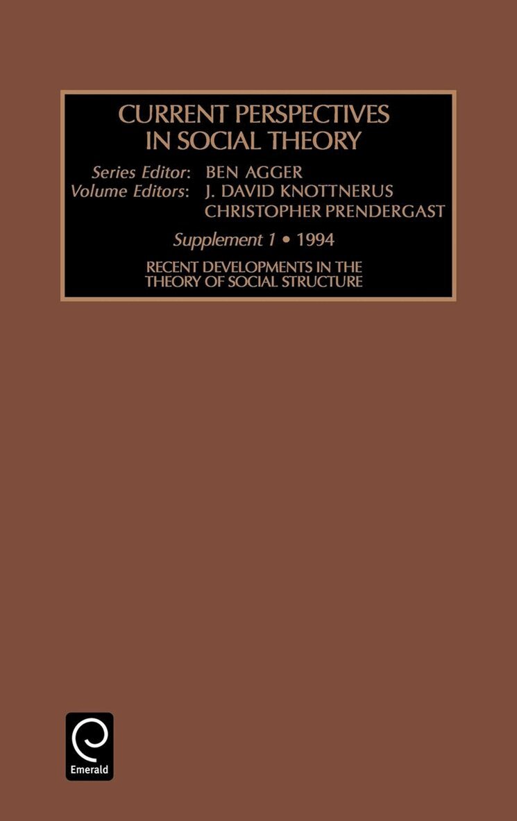 "Recent Developments in the Theory of Social Structure" is an integrated collection of essays reviewing and assessing progress in social structural analysis since 1970. Organizationally, the book is divided into six parts corresponding to six analytical levels of social structure: social relationships, social networks, intraorganizational relations, interorganizational relations, societal stratification and the world system. The ten essays expound and assess what has been learned about the influences of social structure on human behaviour at each level of analysis. In the introduction, the editors examine the metatheoretical issues in structural analysis and promote the cause of theory integration.
