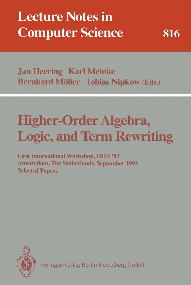 This volume contains the final revised versions of the best papers presented at the First International Workshop on Higher-Order Algebra, Logic, and Term Rewriting (HOA '93), held in Amsterdam in September 1993. Higher-Order methods are increasingly applied in functional and logic programming languages, as well as in specification and verification of programs and hardware. The 15 full papers in this volume are devoted to the algebra and model theory of higher-order languages, computational logic techniques including resolution and term rewriting, and specification and verification case studies; in total they provide a competently written overview of current research and suggest new research directions in this vigourous area.