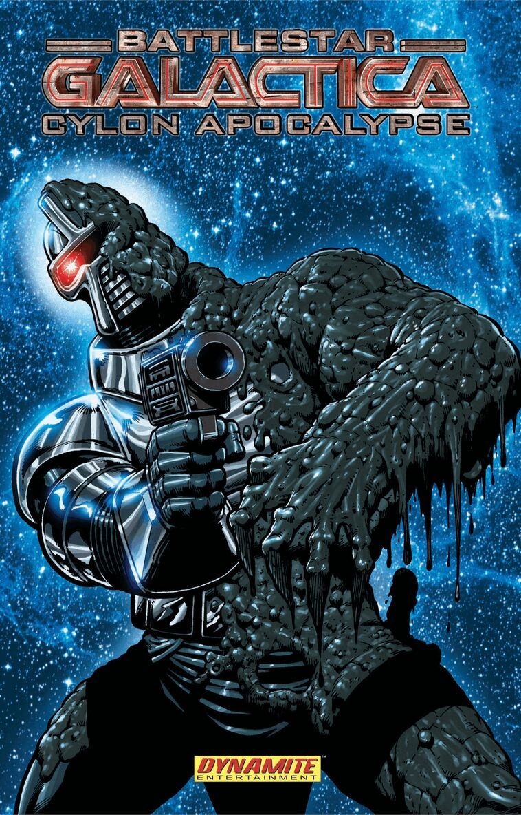 Dynamite Entertainment presents an all-new Battlestar Galactica eventfeaturing the Dynamite debut of Javier Grillo-Marxuach (Lost,Medium) as he unleashes the Cylon Apocalypse!Dual revelations rock the rag-tag fleet as a routine Viper patrol puts themon the edge of a bizarre scene — Cylon Raiders attacking one of their ownBasestars! As the Cylon Basestar crashes into an ocean-covered world, Adama andStarbuck discover a bizarre creature that appears to be a Cylon Centurionengulfed by diseased flesh. The Cylons are sick and the apocalypse hasbegun!Grillo-Maruach is joined by Battlestar artist Carlos Rafael, alongwith colorist Carlos Lopez for this special comic book event, collected here forthe first time! All four issues of the series are collected here along with aspecial cover gallery featuring the works of Jim Starlin, Michael Golden, PatLee, Carlos Rafael, and Stephen Sadowski.