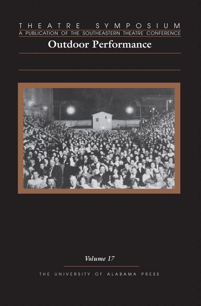 Outdoor drama takes many forms: ancient Greek theatre, open-air performances of Shakespeare at summer festivals, and re-enactments of landmark historical events. The essays gathered in 'Outdoor Performance,' Volume 17 of the annual journal Theatre Symposium, address outdoor theatre's many manifestations, including the historical and non-traditional. Among other subjects, these essays explore the rise of 'airdomes' as performance spaces in the American Midwest in the first half of the 20th century; the civic-religious pageants staged by certain Mormon congregations; Wheels-A-Rolling, and other railroad themed pageants; first-hand accounts of the innovative Hunter Hills theatre program in Tennessee; the role of traditional outdoor historical drama, particularly the long-running performances of Paul Green's The Lost Colony; and the rise of the part dance, part sport, part performance phenomenon 'parkour'-- the improvised traversal of obstacles found in both urban and rural landscapes.
